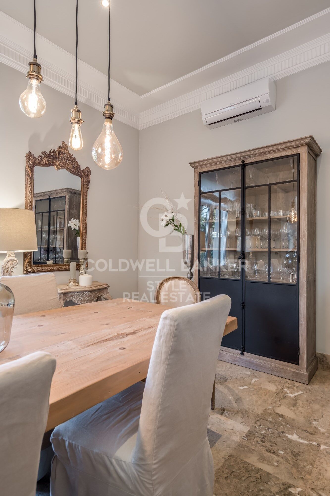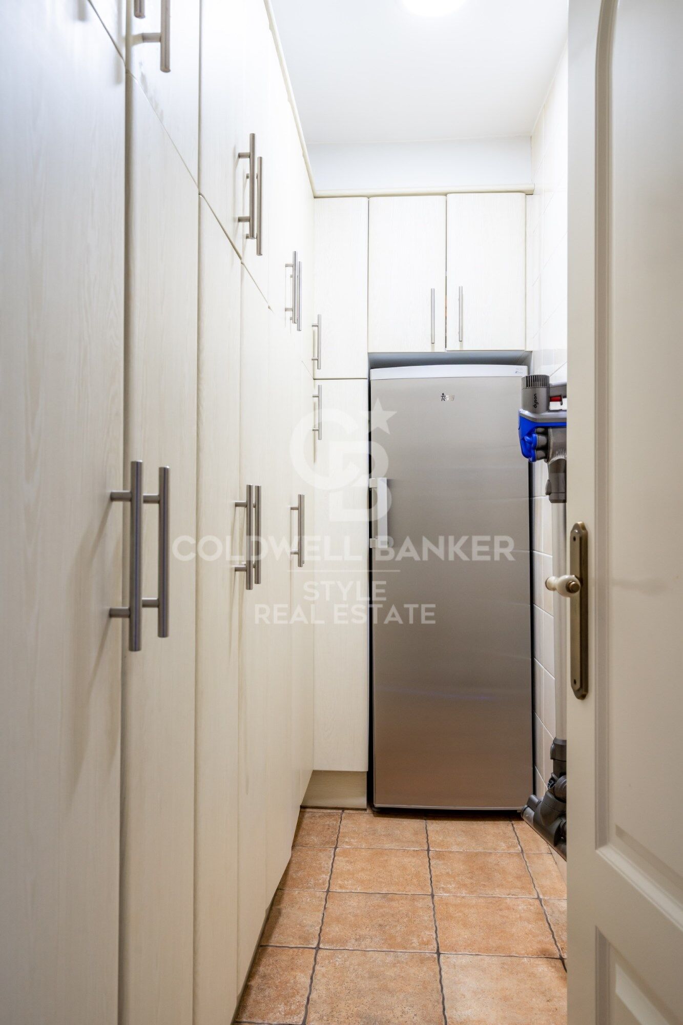 On the left we find a modern and exclusive living room with exquisite decoration and a fireplace to accompany those cold winter days. Connected to it is the dining room with a large and beautiful wooden table where you can accommodate many guests. The kitchen with office also connected to the dining room houses a pantry where you can store all the products.