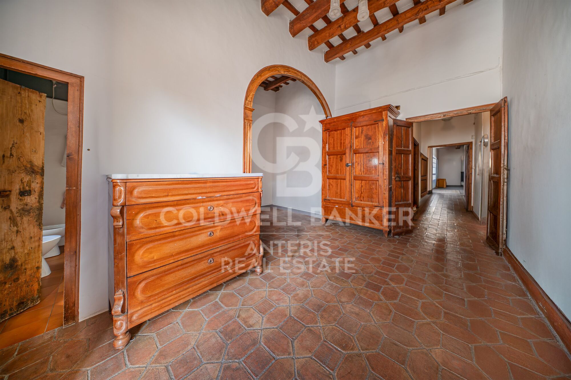 The classic-style property, renovated in 1995, retains original features such as hydraulic floors, wooden beams, and wall paintings. It is distributed over three floors and consists of 7 bedrooms, 3 bathrooms, spacious rooms, high ceilings, and plenty of natural light. It includes a private terrace, outdoor studio, laundry room, and storage room.