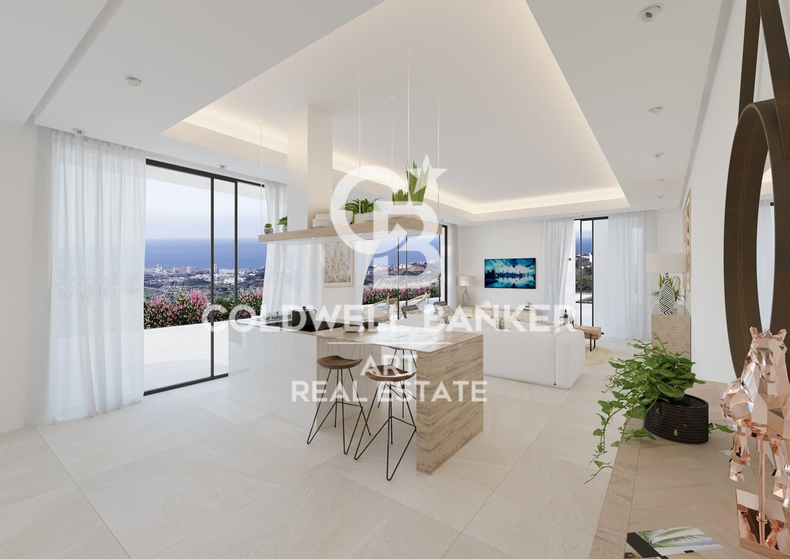 Villas Mijas Views boasts a well-distributed interior space where the living room, dining room, and fully equipped kitchen with breakfast area merge into a space that maximizes the views from the large triple-sided doors and windows. The connection between the outdoor and indoor spaces is seamless, with generous covered and open terraces, the perfect place to relax and enjoy the views of the Mediterranean Sea.