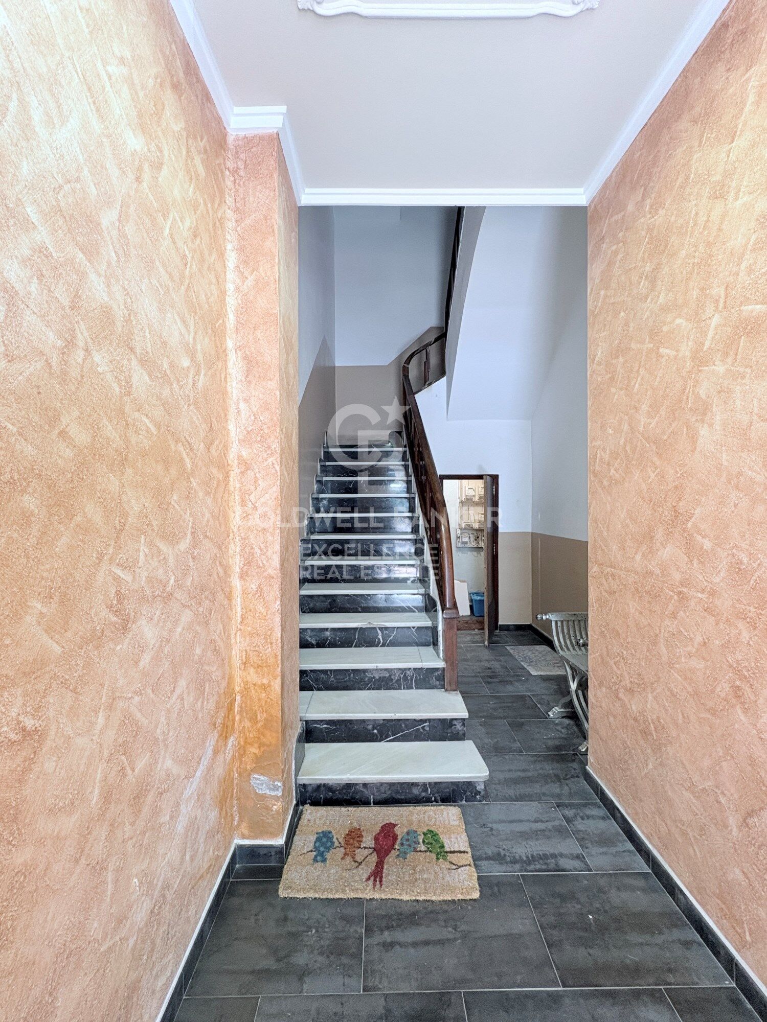 - Stately façade and marble staircase with wooden handrails