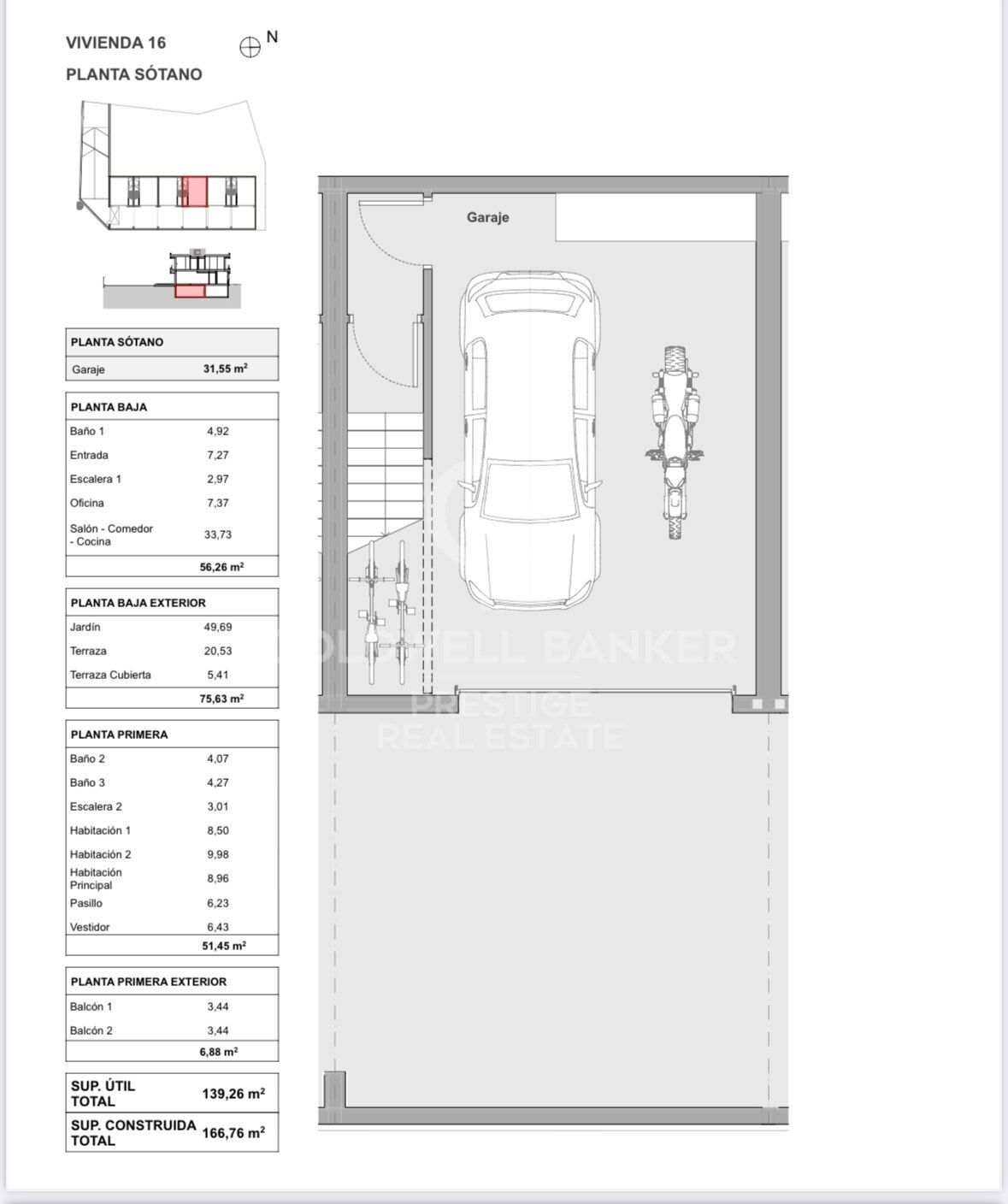 Each home offers a usable area of 139.26 m² and a total built area of 166.76 m², distributed over three levels: