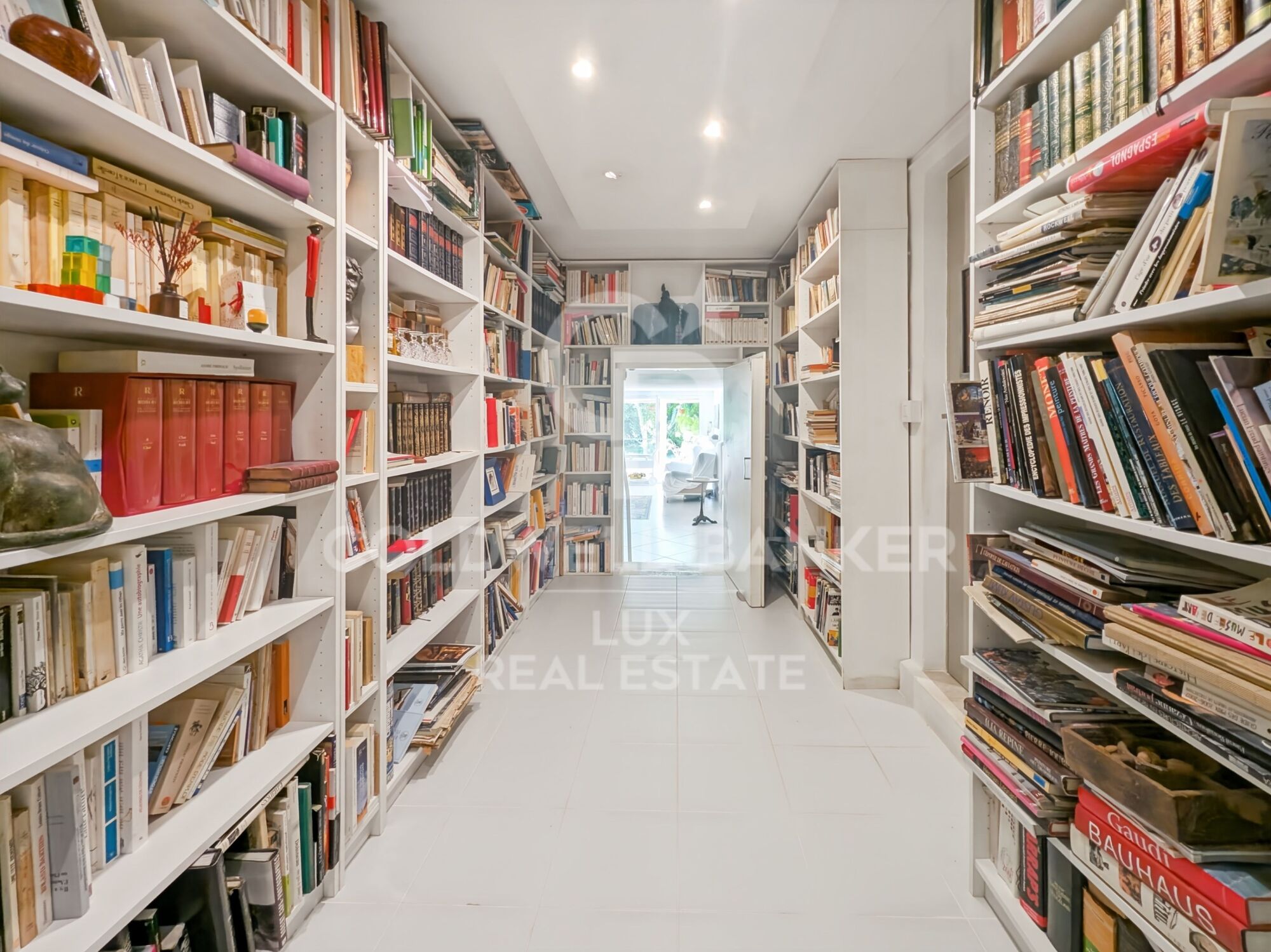 The main house comprises a large living room with a fireplace, extended by a large terrace, an open-plan kitchen and dining room, a second terrace with access to the swimming pool, and four bedrooms distributed around the living areas. Two independent apartments complete the property: the first with a living room, kitchen, two bedrooms and a bathroom; the second, more compact, with two rooms and a shower room. A library and office area provide separate workspaces and reading areas.