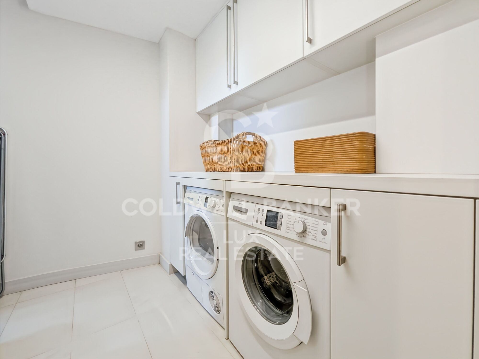 The house is spread over three floors connected by a lift. From the entrance, there is an unobstructed view of the garden, swimming pool (7mx3m) and golf course. The living area includes a lounge, reading corner and dining room, with large windows opening onto the outside. The separate, fully equipped kitchen has direct access to the terrace, as do the four bedrooms, each with its own bathroom.