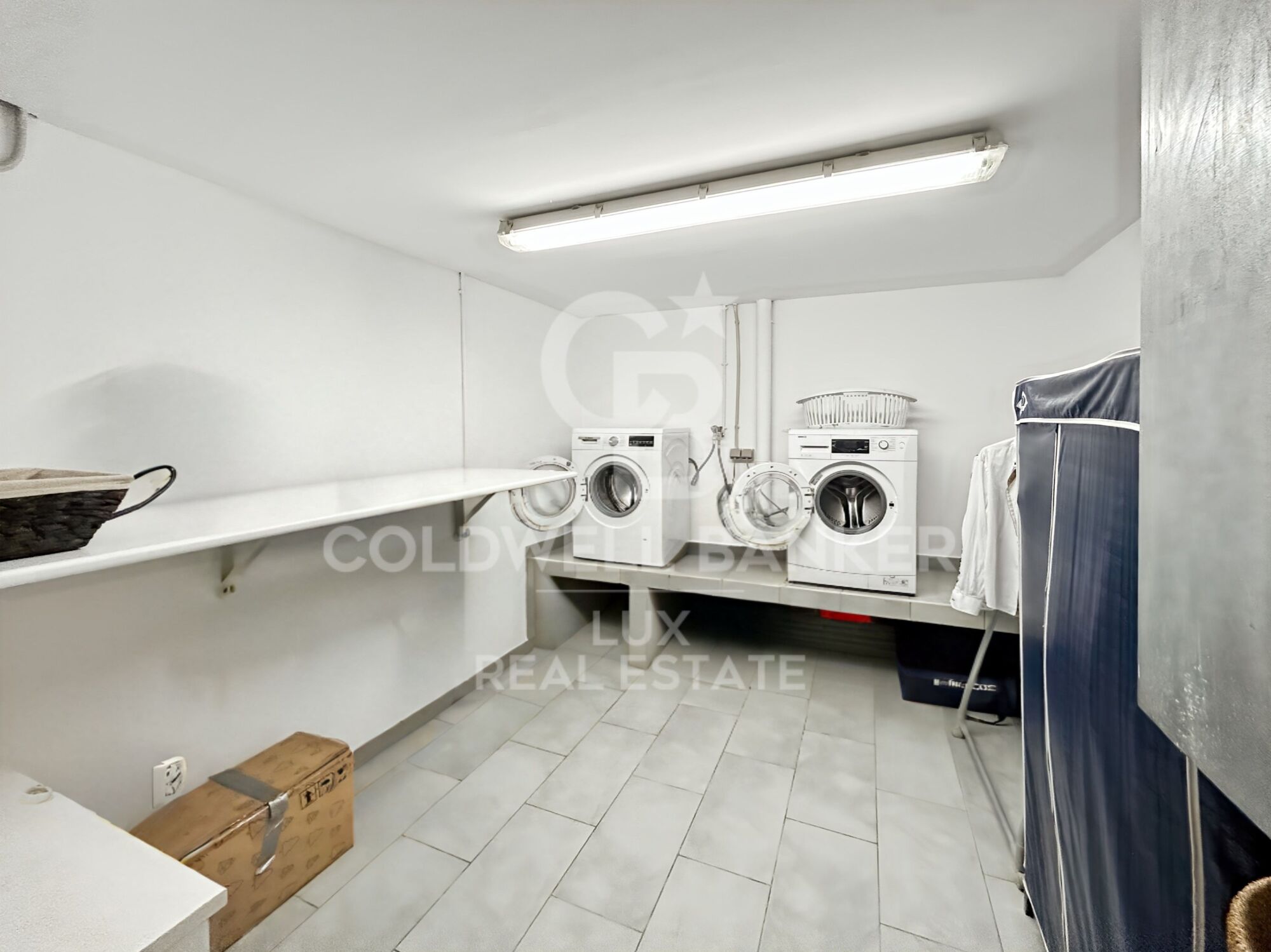 The lower level offers a cozy living space, a guest toilet, a utility room, a garage, and a laundry room with a practical laundry chute.