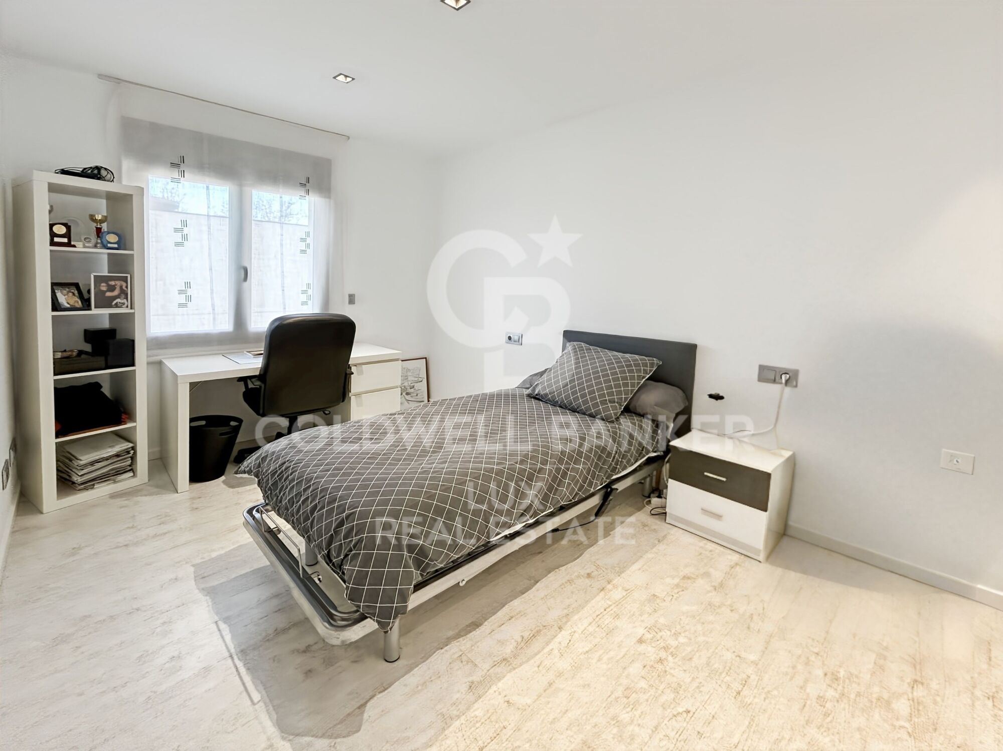 On the ground floor, an open-plan kitchen with an island, fully equipped with Bosch appliances, connects to the living-dining area, which opens onto the outdoor space. There is also a bedroom with built-in wardrobes and direct access to the garden, as well as a complete bathroom with an Italian-style shower.