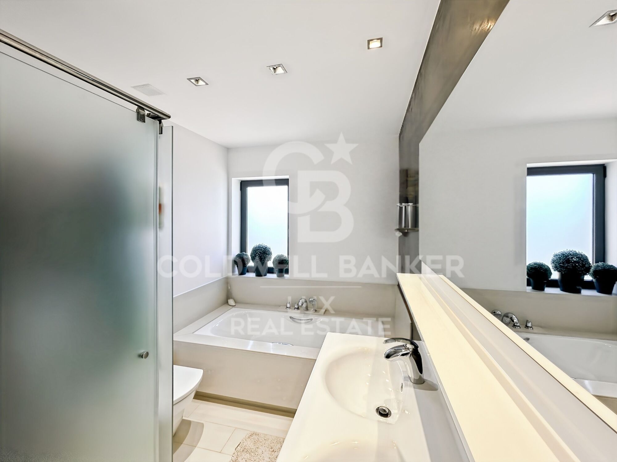 The first floor features three double bedrooms with built-in wardrobes. Two of them have access to an outdoor terrace, while the master suite includes a dressing area, a full bathroom with a shower and bathtub, and access to the terrace. Additionally, there is a third full bathroom with a shower on this floor.