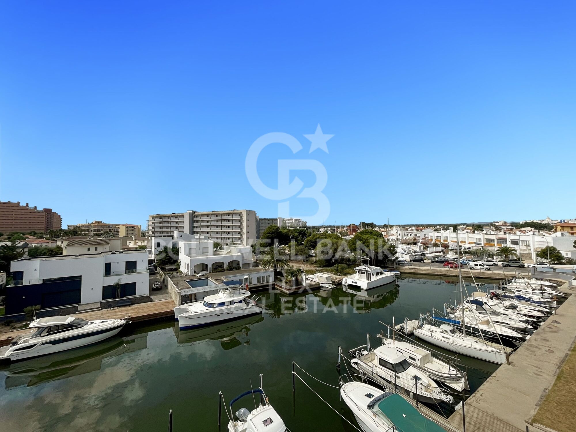 The fully equipped kitchen is integrated with the laundry area and opens to the living-dining room. The large windows in the living area offer a view of the canal and provide direct access to a spacious outdoor terrace with dining and chill-out areas.