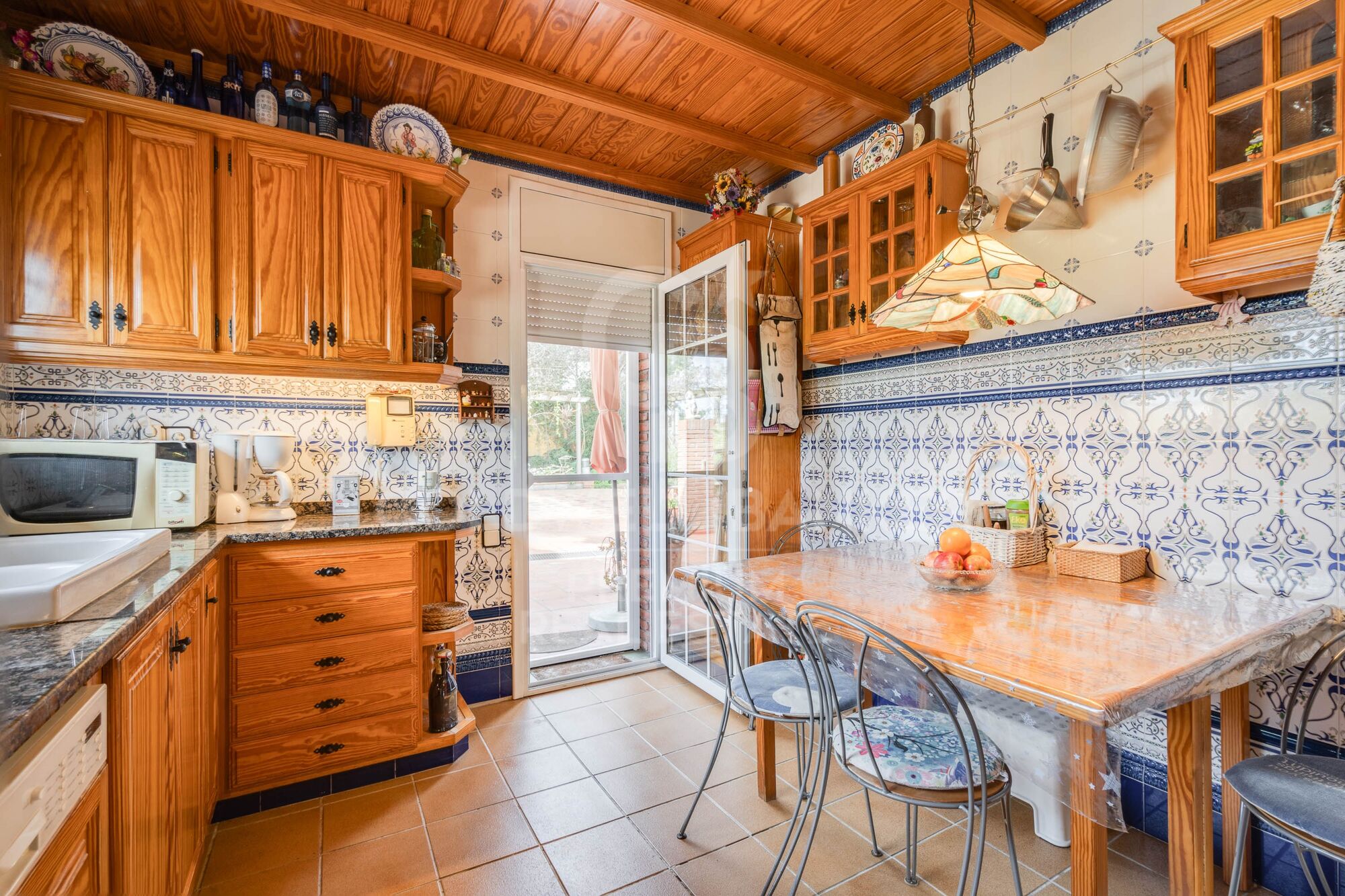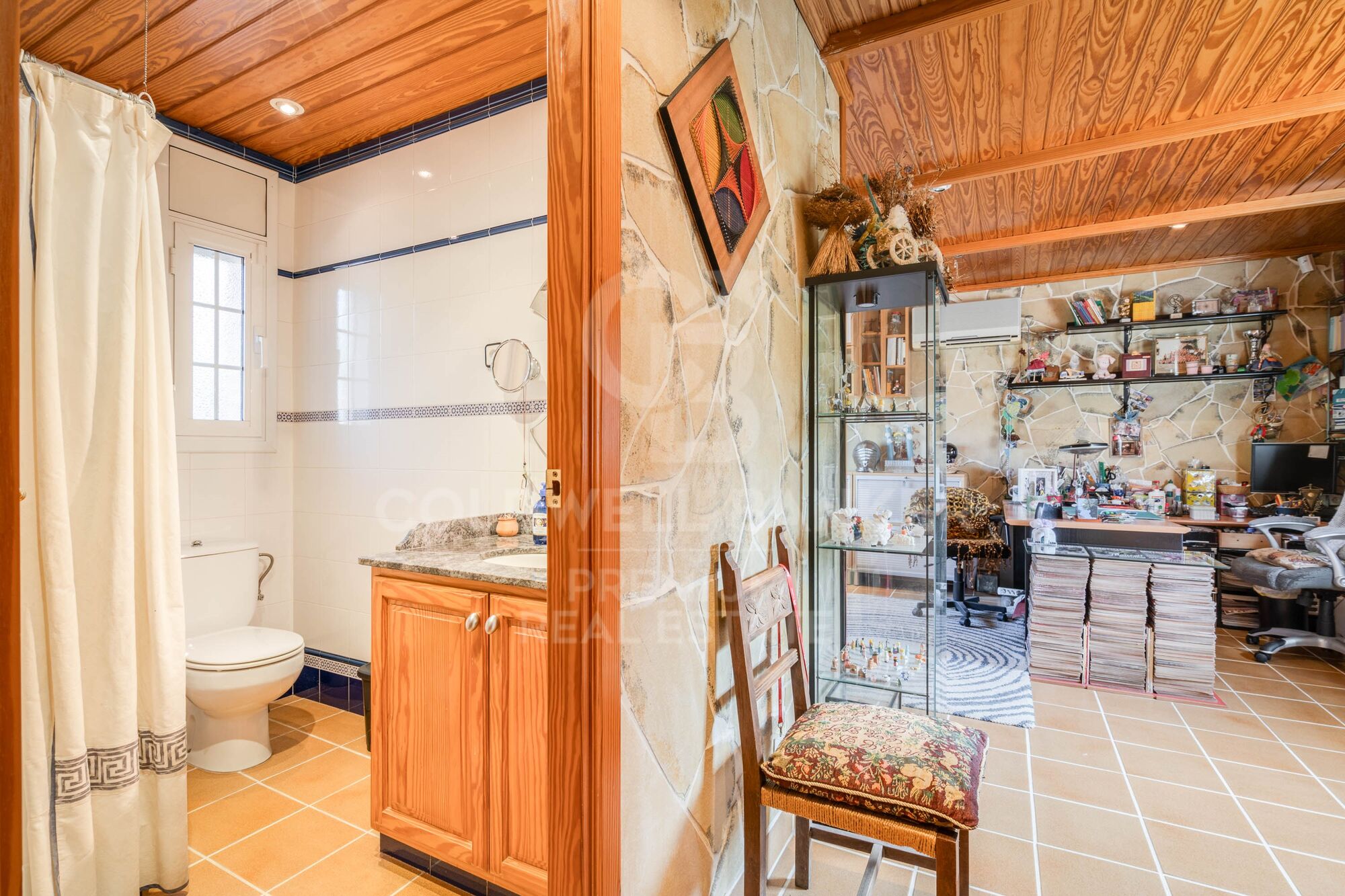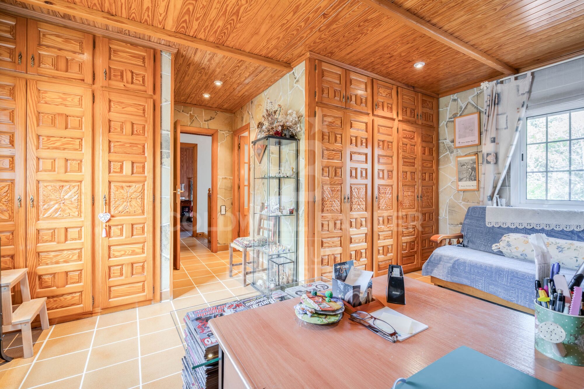 The first step takes you to a spacious hall, from where a bright dining room with a cosy fireplace opens up, the perfect place to meet with family and friends. From here, you can revel in the views of the lush garden that surrounds the property. The fully equipped kitchen and a guest bathroom complete this floor, each space with access to the outside for seamless integration with the natural surroundings.
