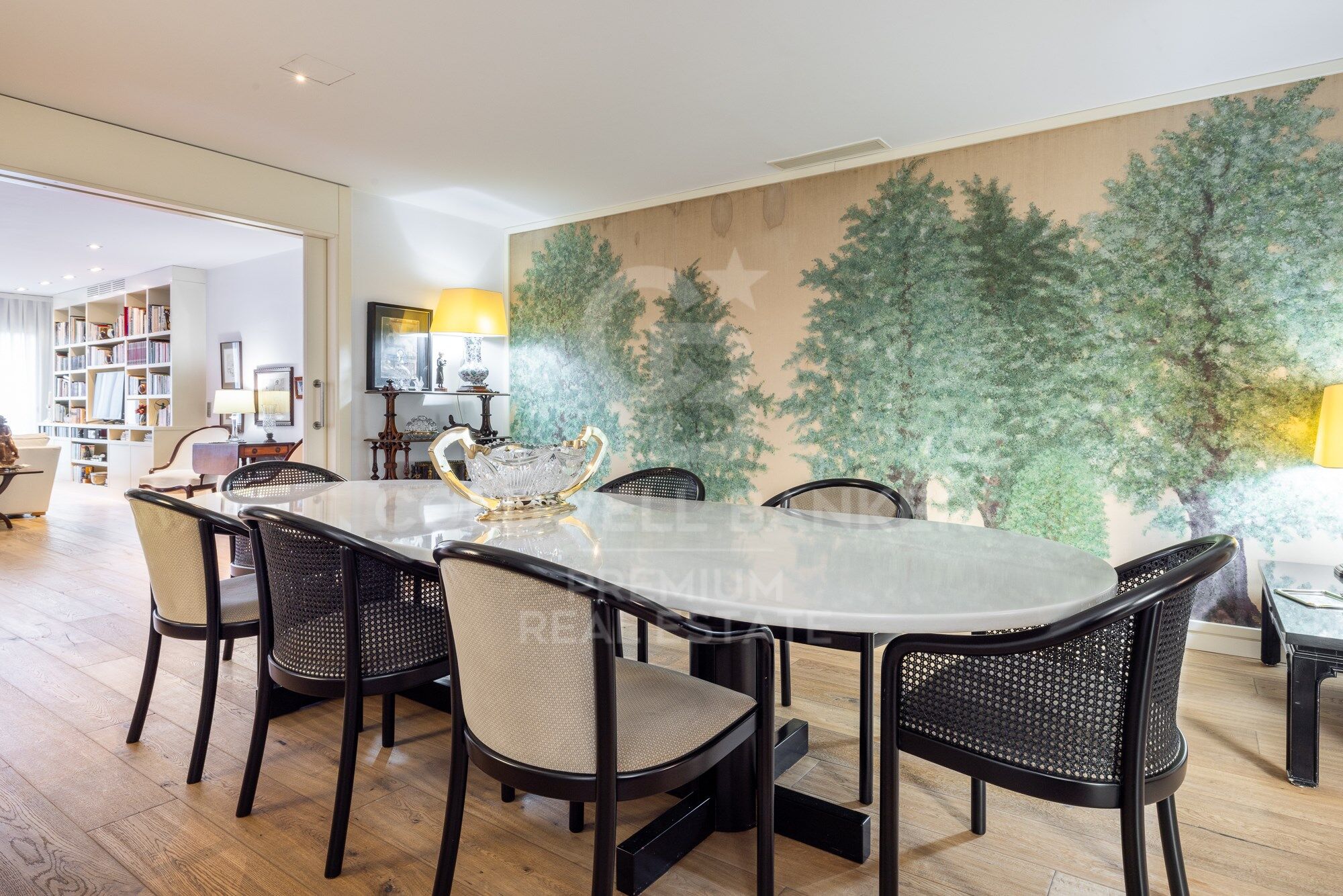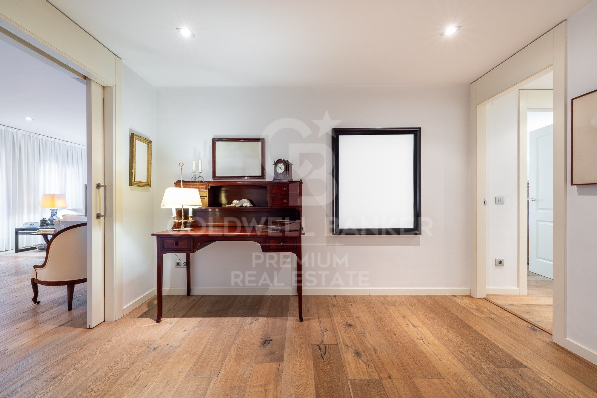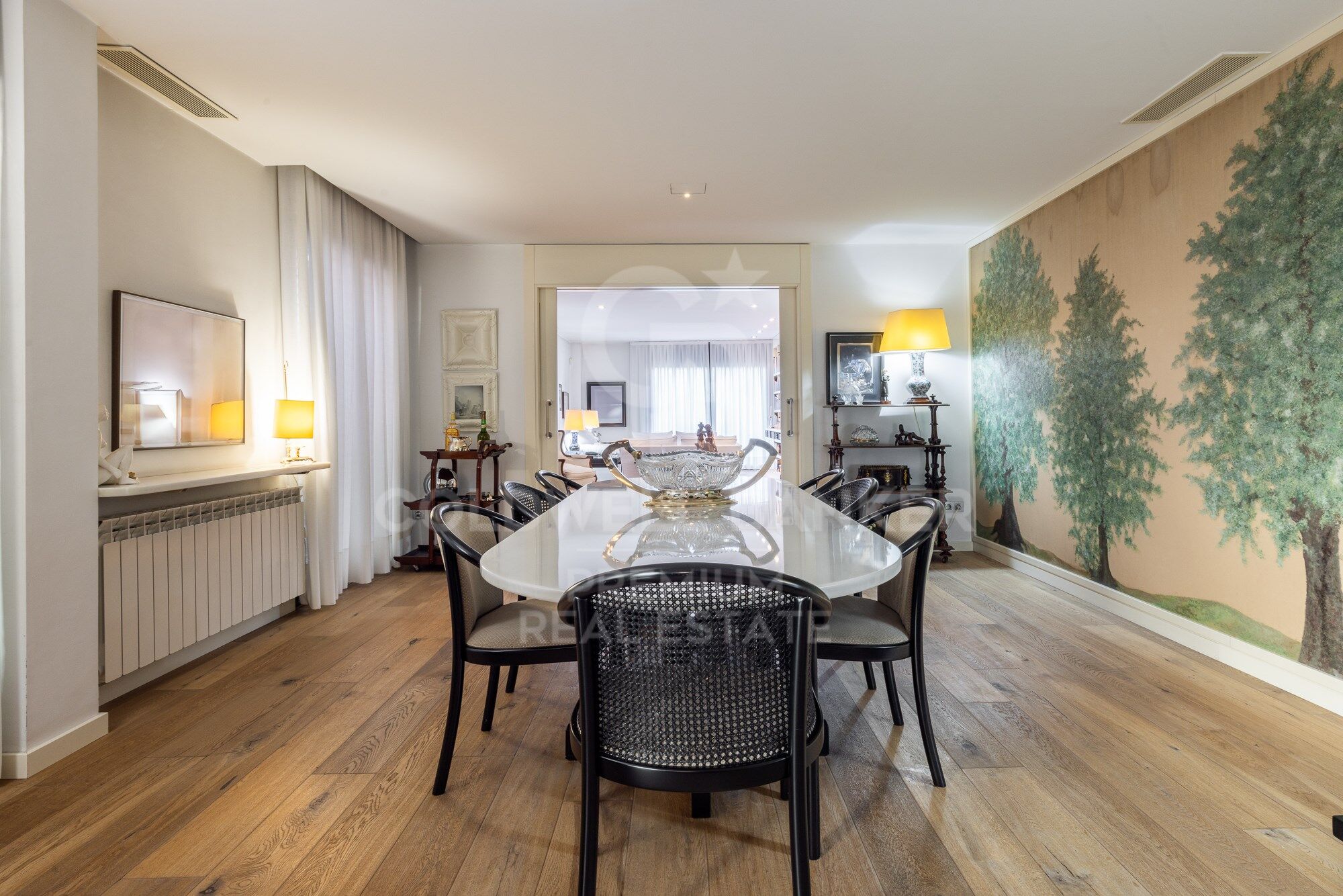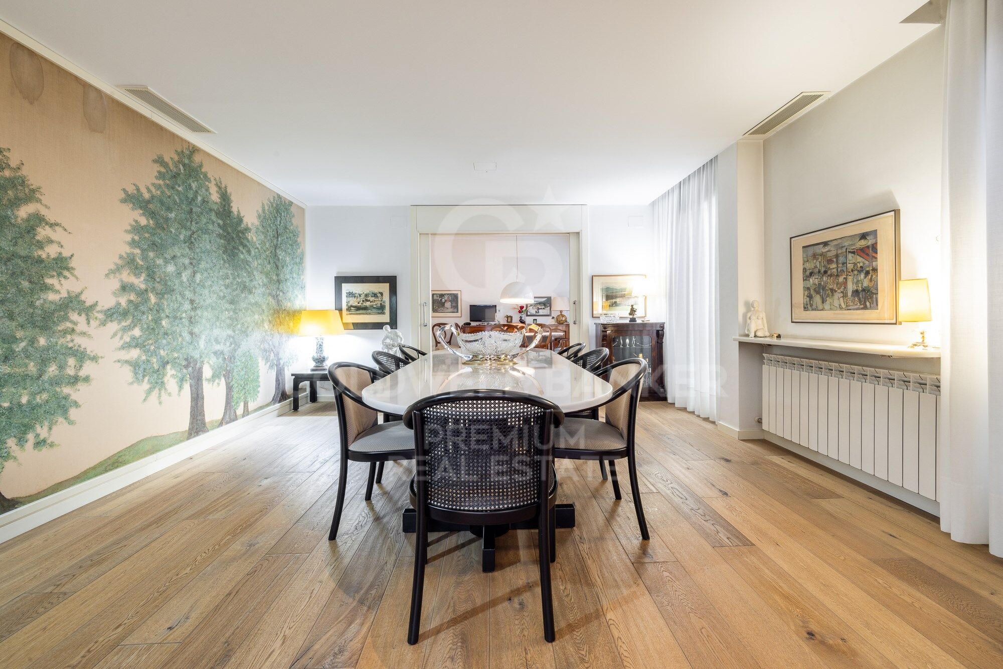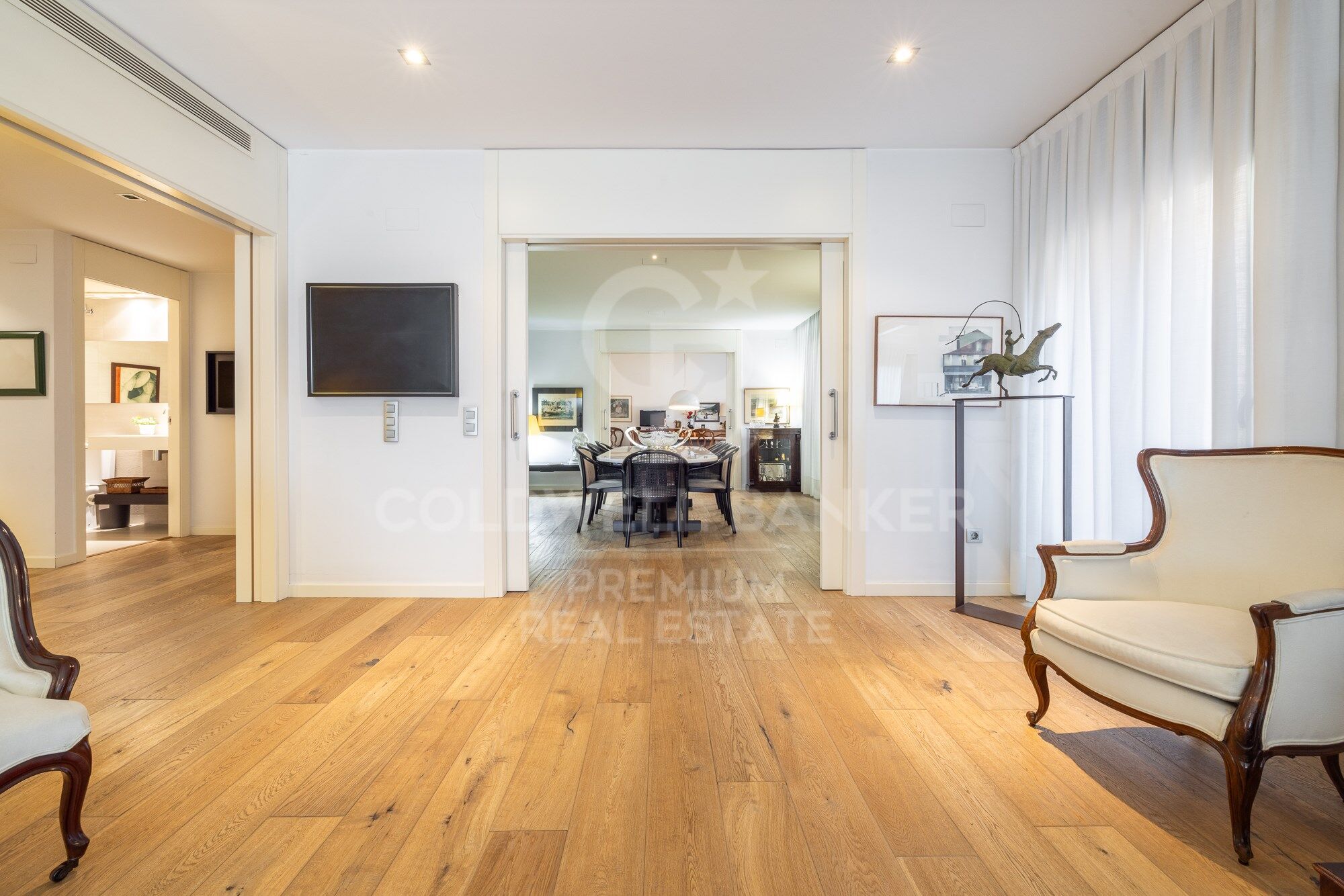 We enter through a generous entrance hall, where the wonderful natural parquet flooring is the common denominator throughout the house, as well as its interior carpentry made entirely to measure and lacquered in white. We enter the spacious living room, which houses various ambiences.