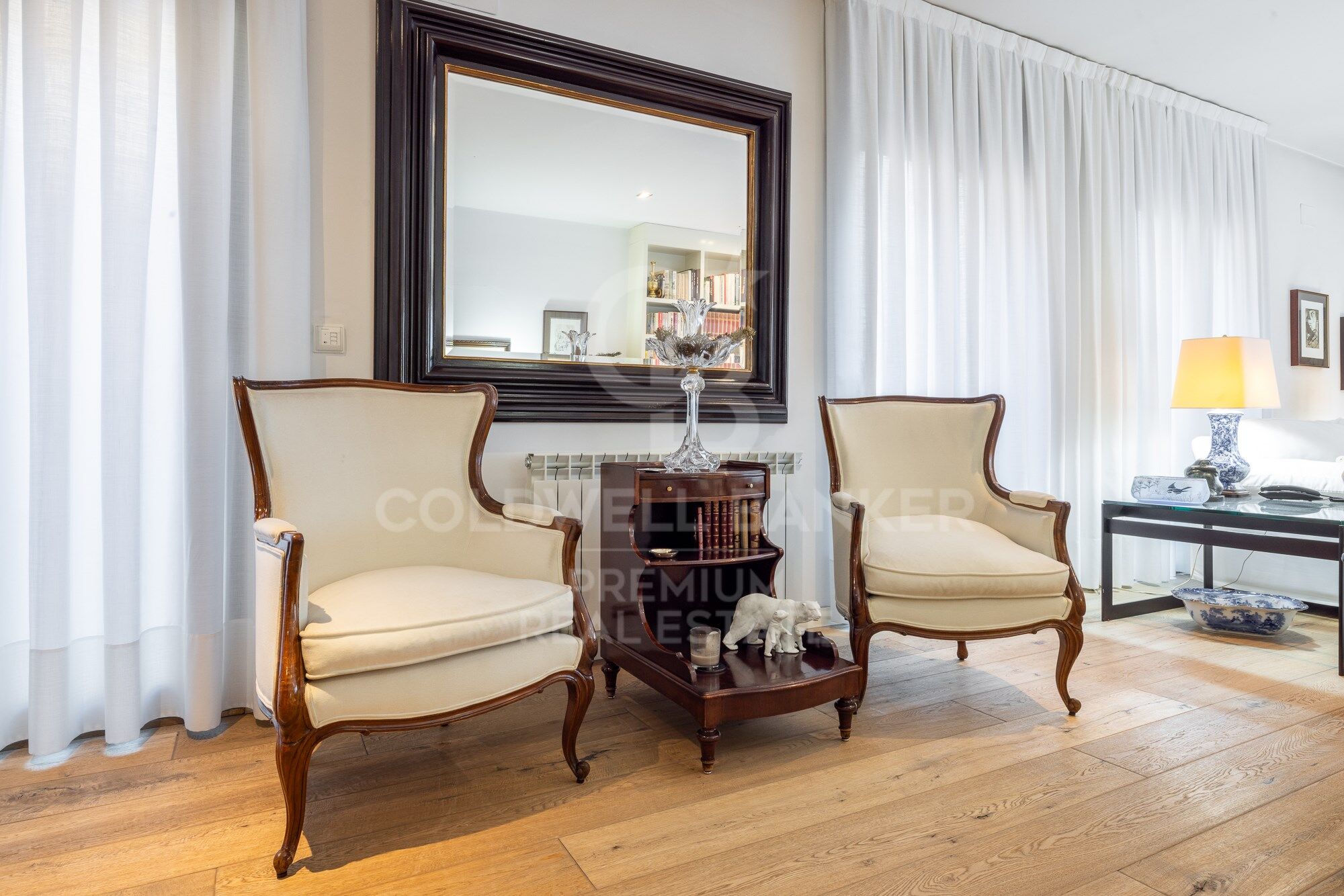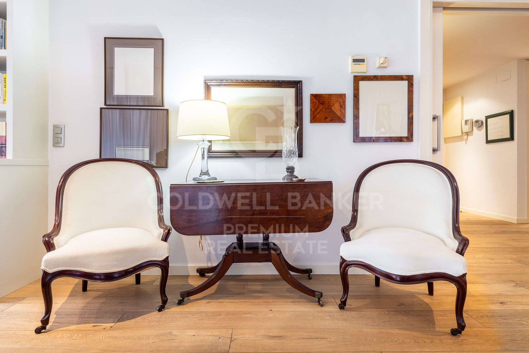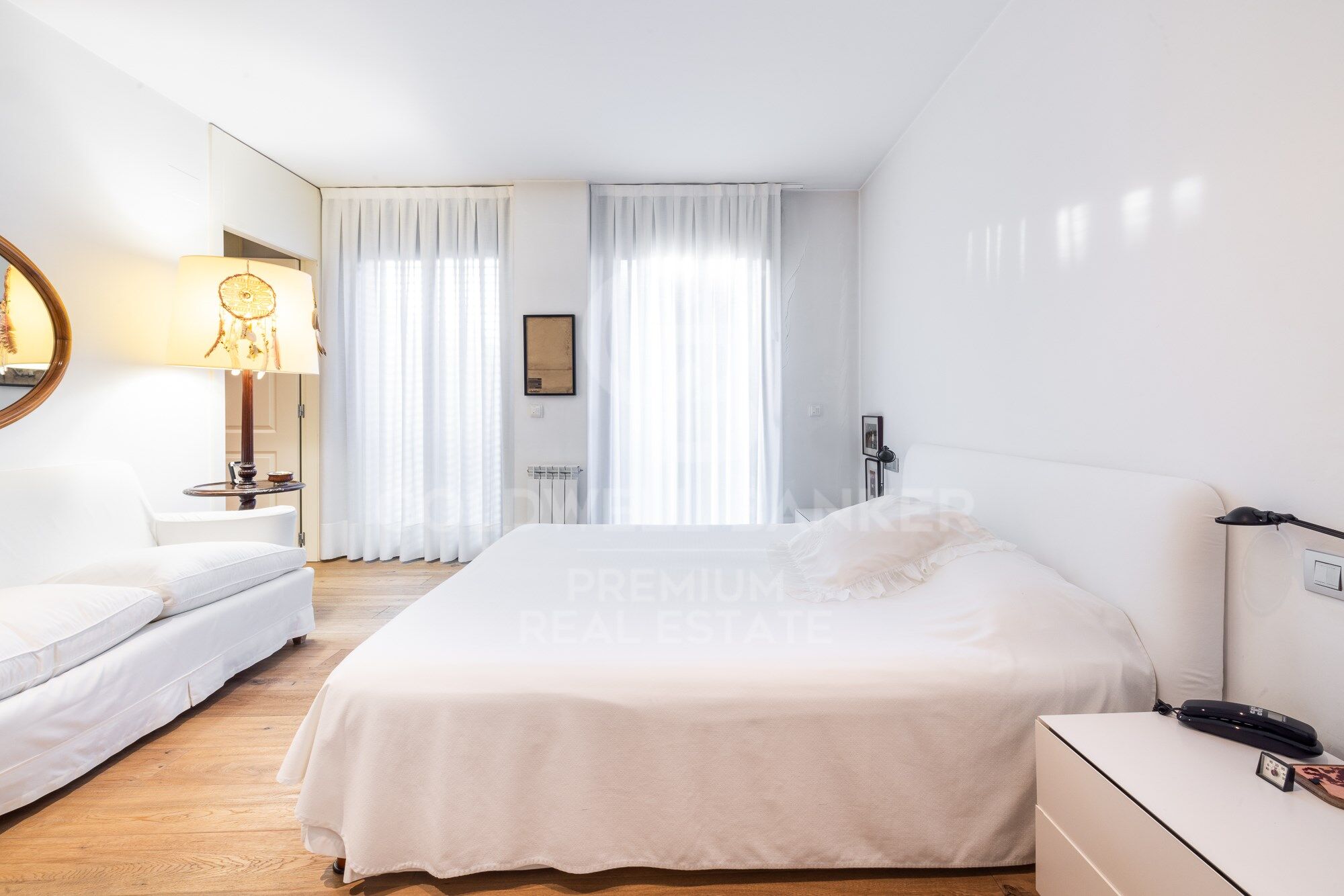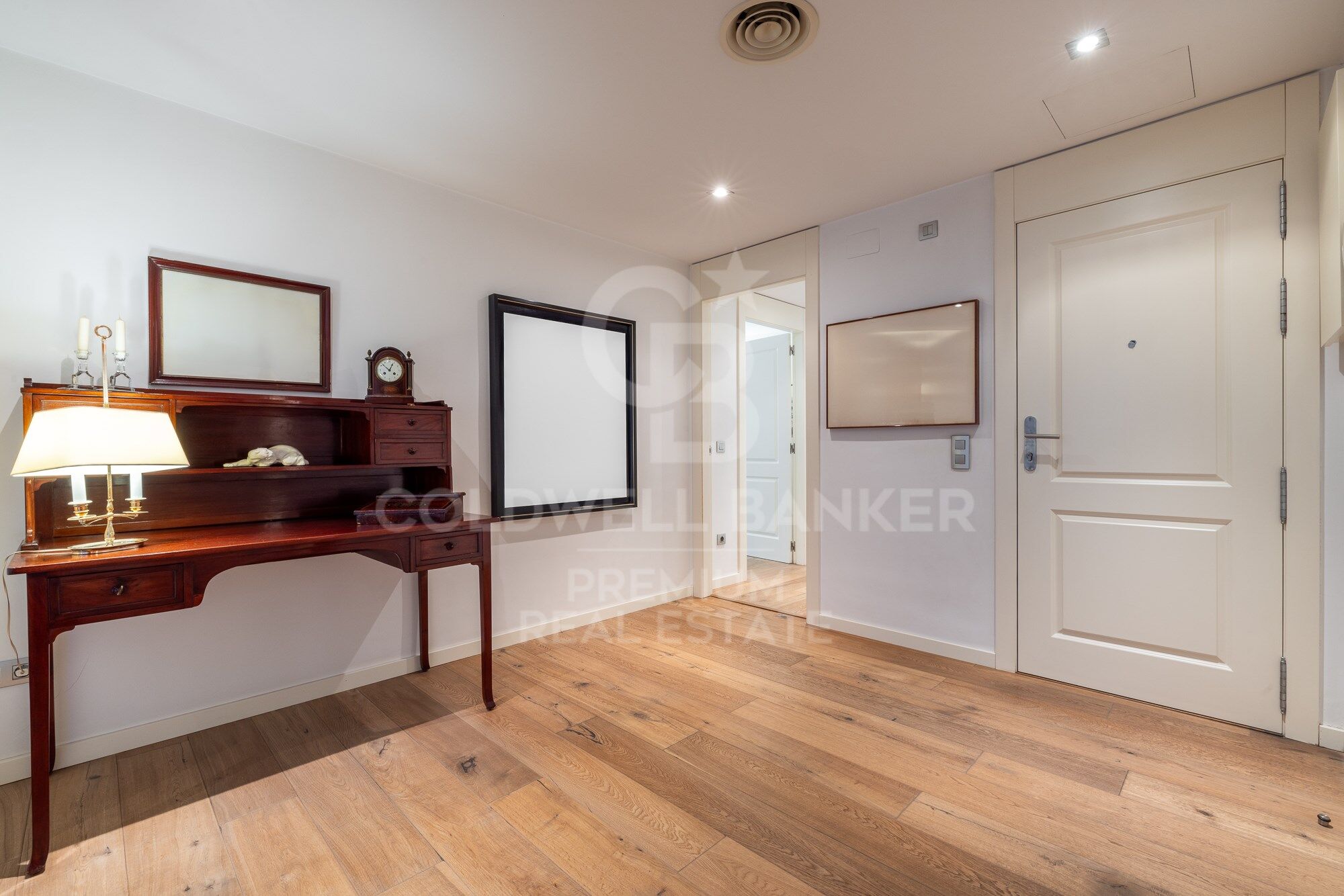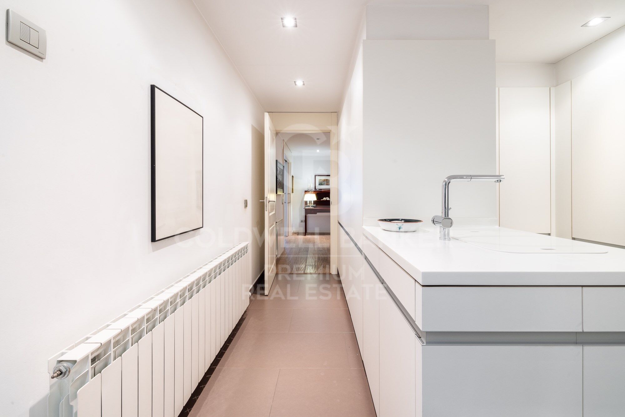 We enter through a generous entrance hall, where the wonderful natural parquet flooring is the common denominator throughout the house, as well as its interior carpentry made entirely to measure and lacquered in white. We enter the spacious living room, which houses various ambiences.