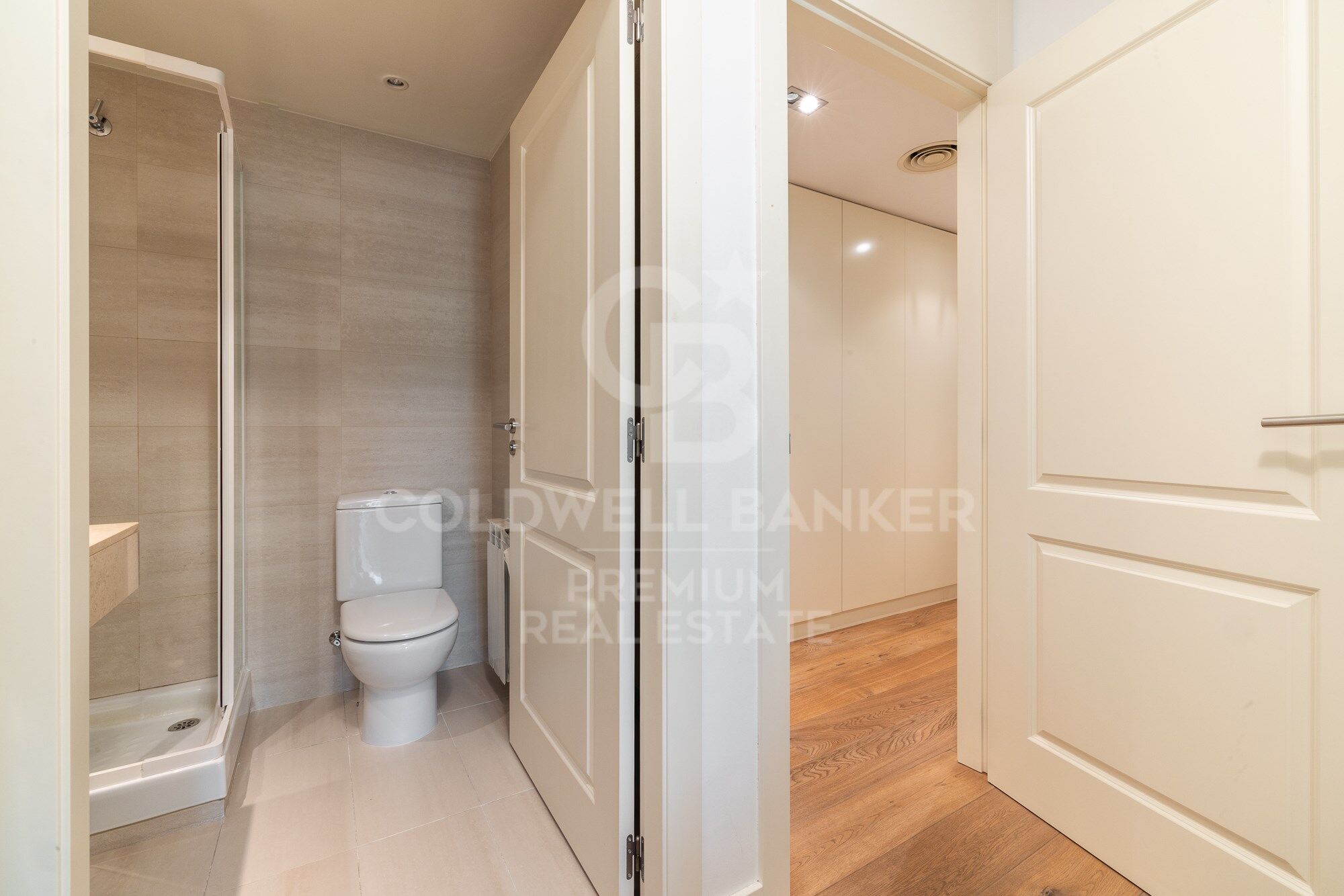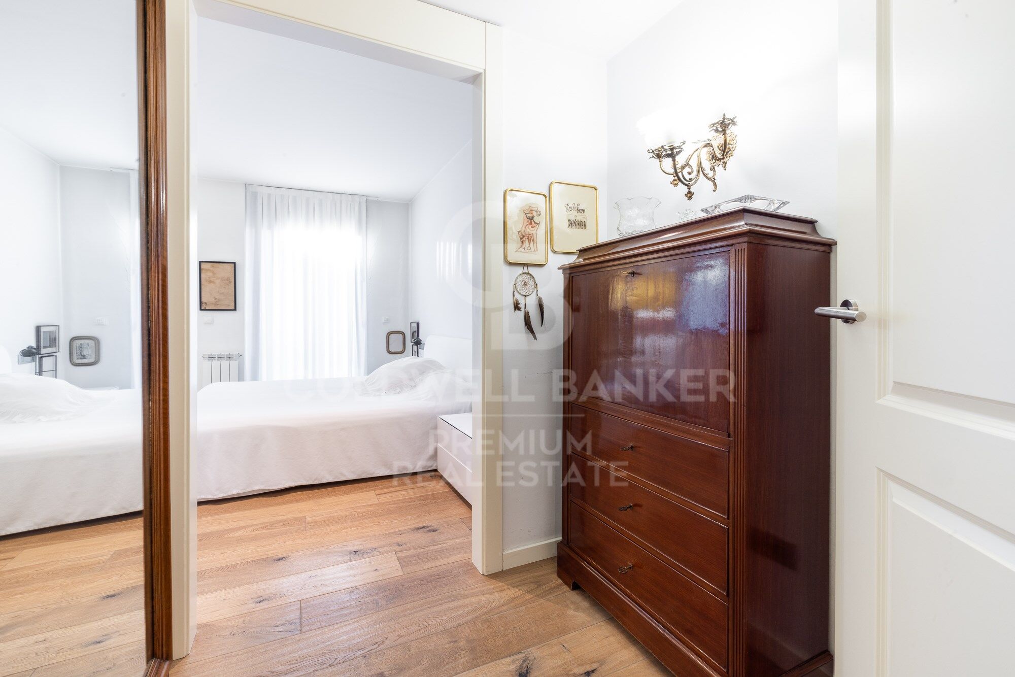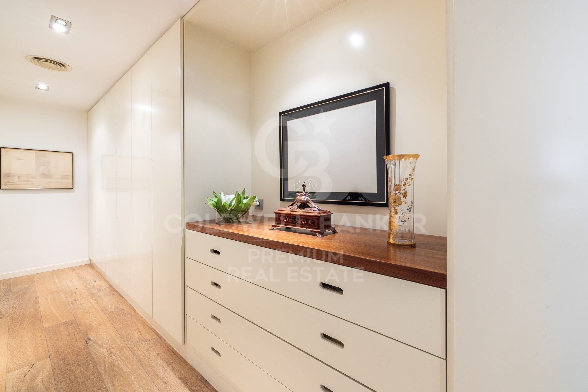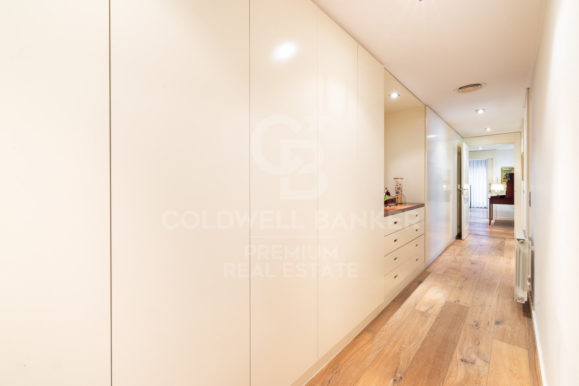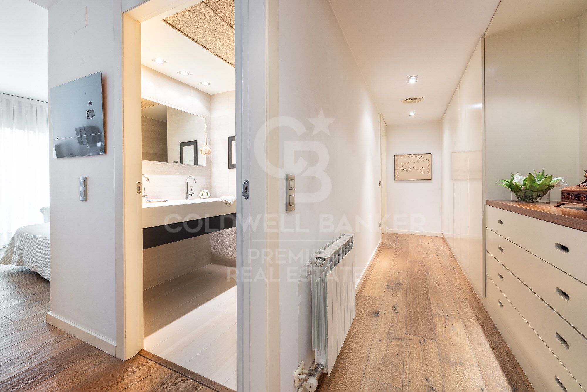 We continue moving forward and from the kitchen we reach the hallway, which has a courtesy toilet. From this point, on the right, we access the night area. A beautiful corridor with magnificent wardrobes and made-to-measure chests of drawers leads to each bedroom. There are three bedrooms, two doubles and one single. All of them have an en-suite bathroom. The master bedroom also has a large dressing room. The south orientation makes all the bedrooms warm and luminous.