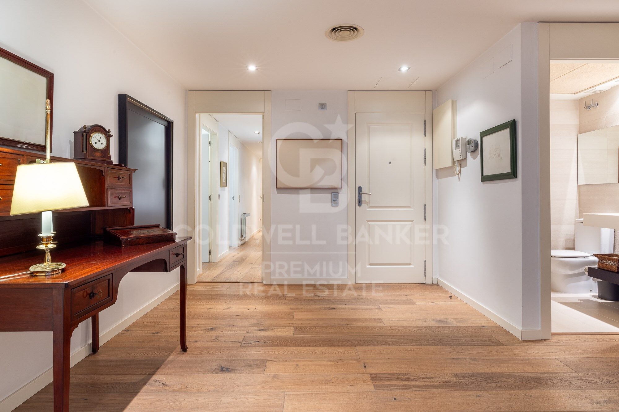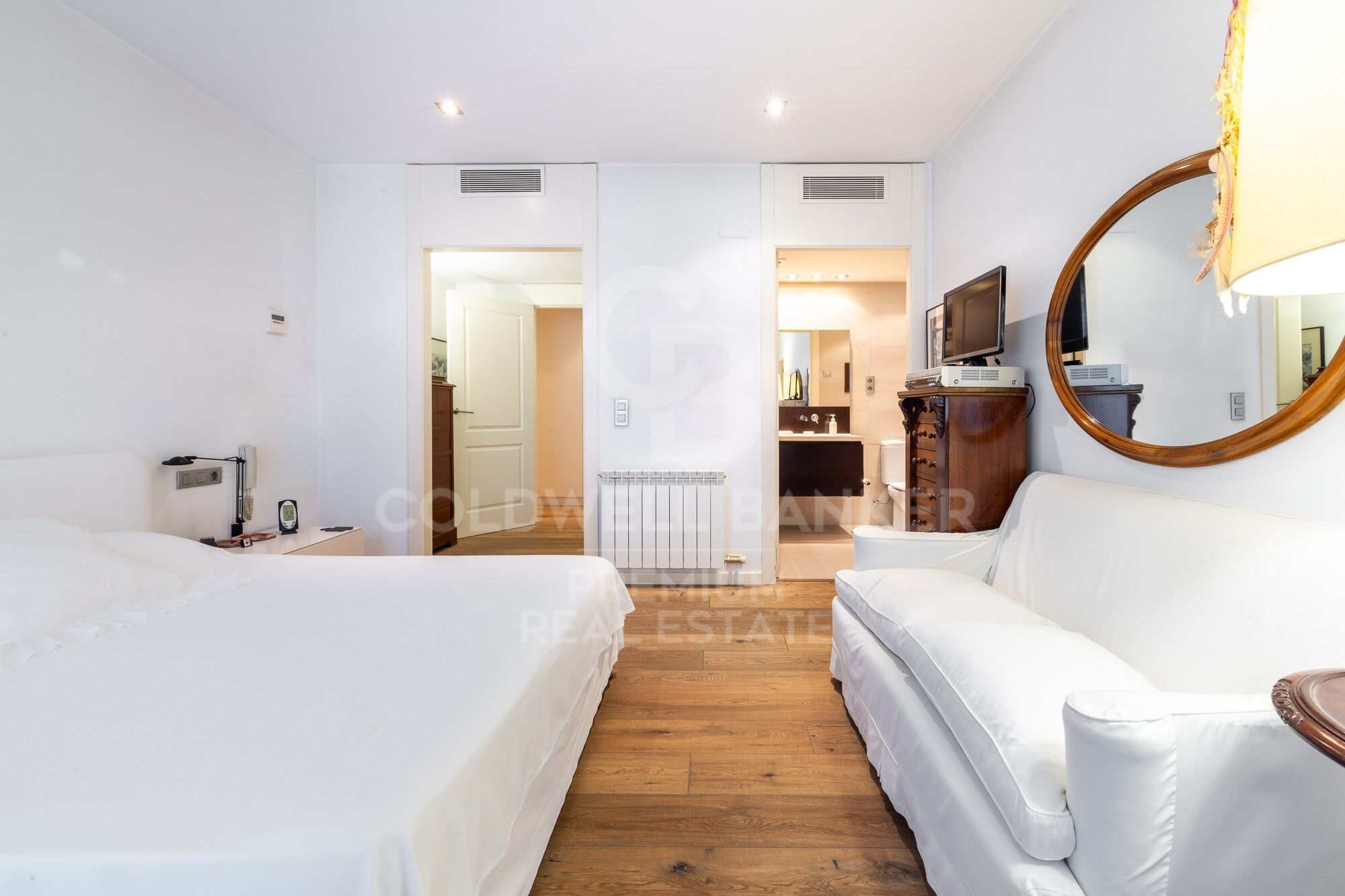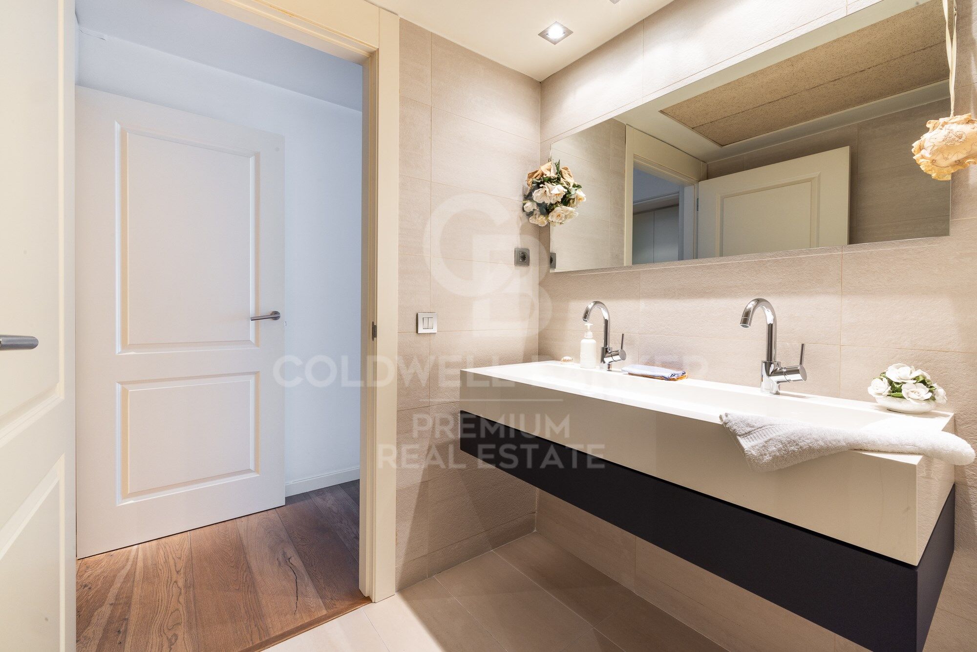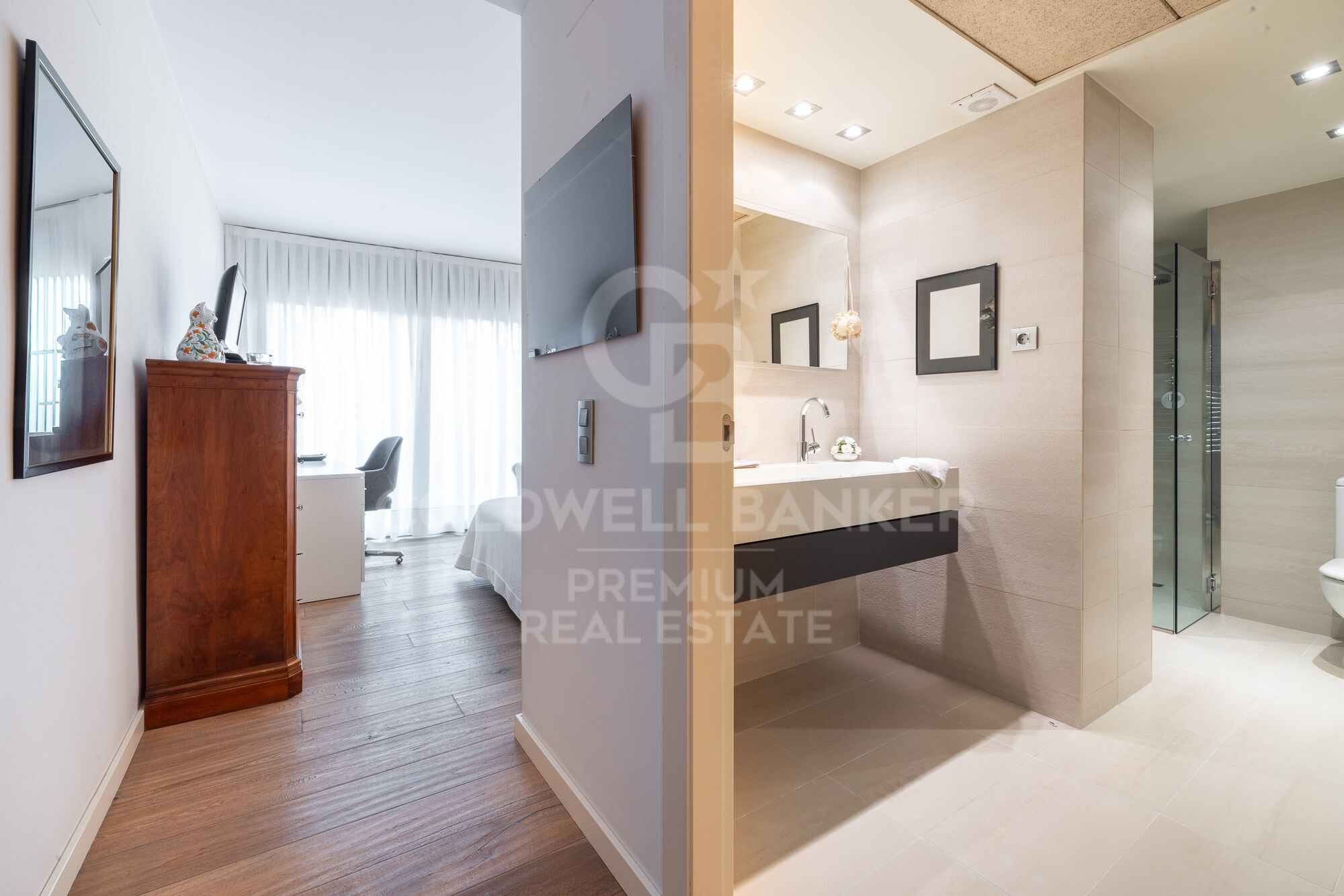 We continue moving forward and from the kitchen we reach the hallway, which has a courtesy toilet. From this point, on the right, we access the night area. A beautiful corridor with magnificent wardrobes and made-to-measure chests of drawers leads to each bedroom. There are three bedrooms, two doubles and one single. All of them have an en-suite bathroom. The master bedroom also has a large dressing room. The south orientation makes all the bedrooms warm and luminous.