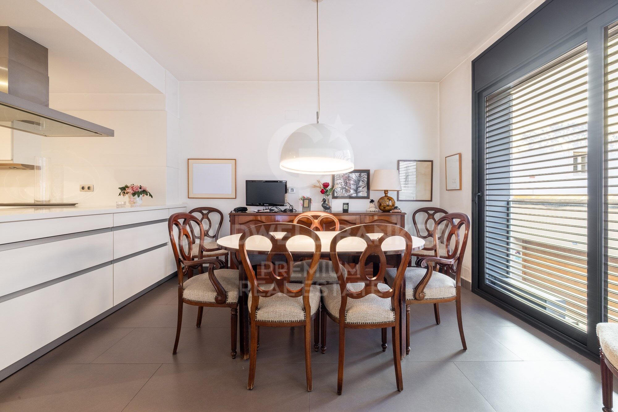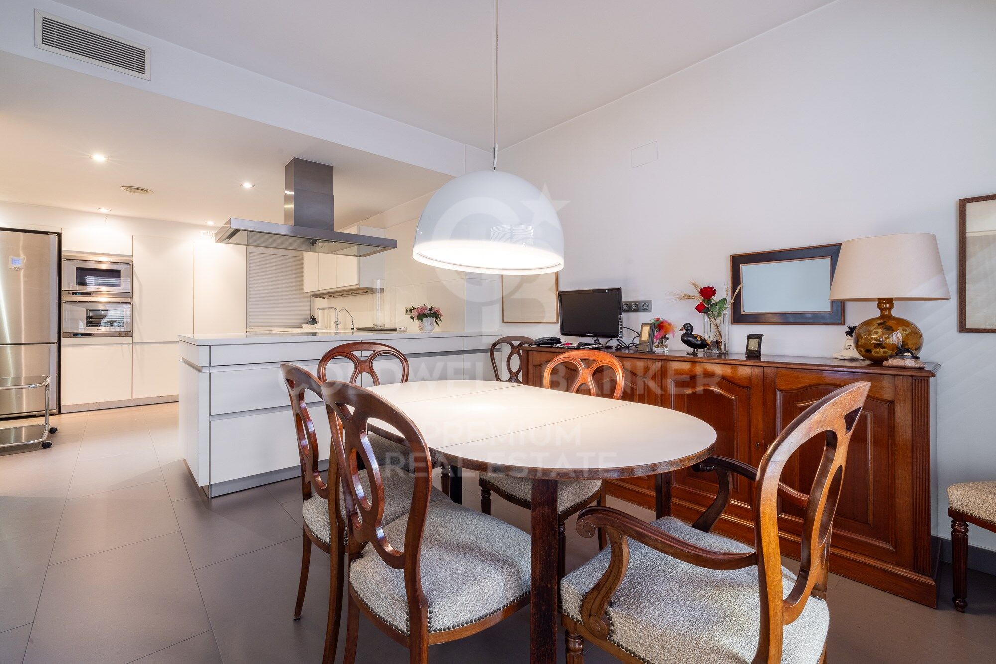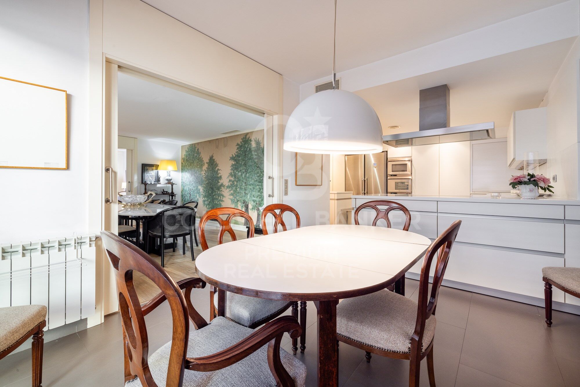 Through a circular layout we reach the beautiful dining room, undoubtedly one of the stars of the house, where the most intimate lunches and dinners can be held. The space is equipped with sliding doors to make it completely independent from the neighbouring rooms. We continue and arrive at the kitchen, divided into two spaces, on one side we find the office that functions as a newspaper dining room or as a meeting area for cocktails, aperitifs or brunches. On the other hand, we find the cooking area, which has a large work surface, a large storage area, a water and ironing area. The whole space is visually connected because there are no separating walls. But the layout of the kitchen itself prevents it from being totally exposed to the dining room or the living room.