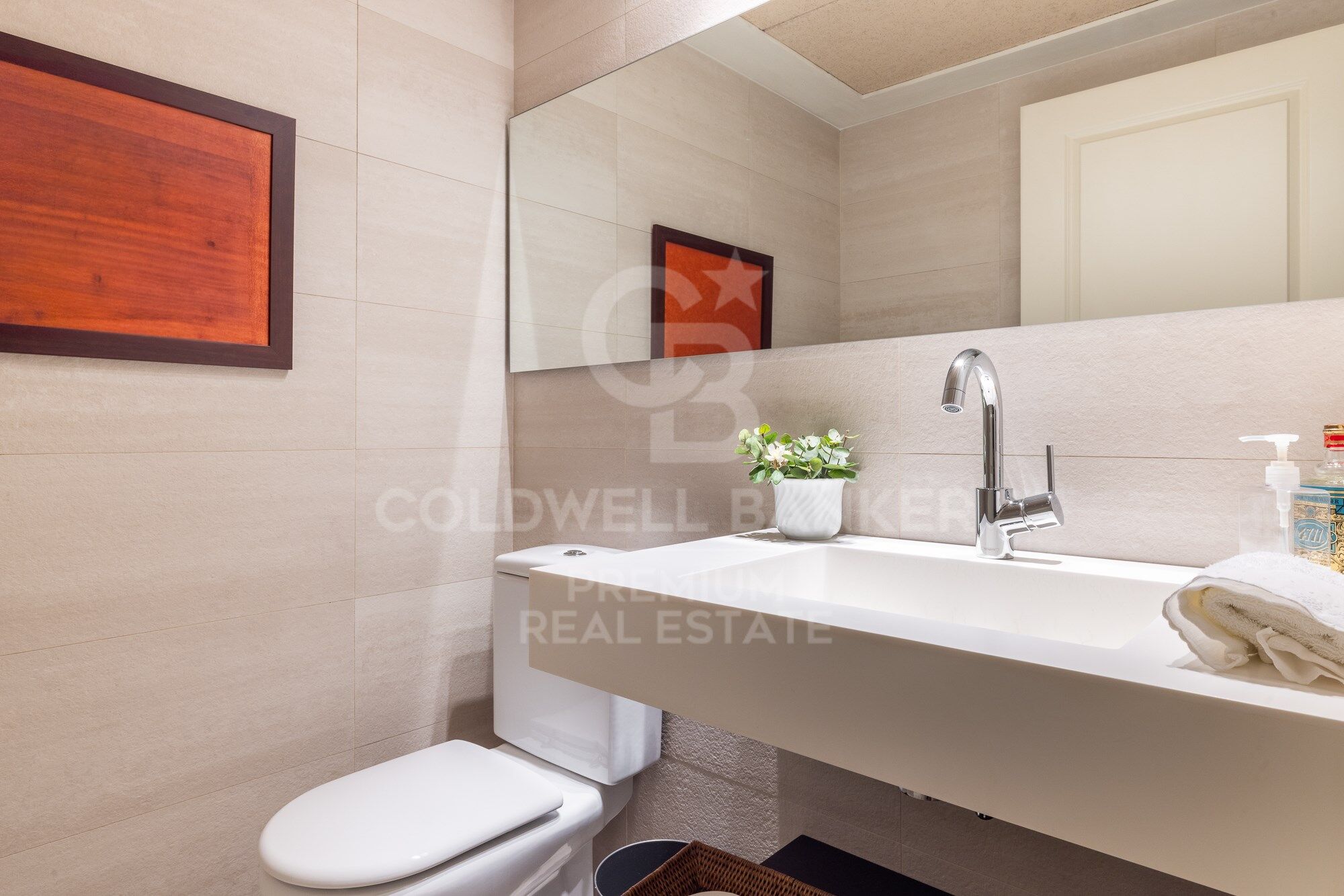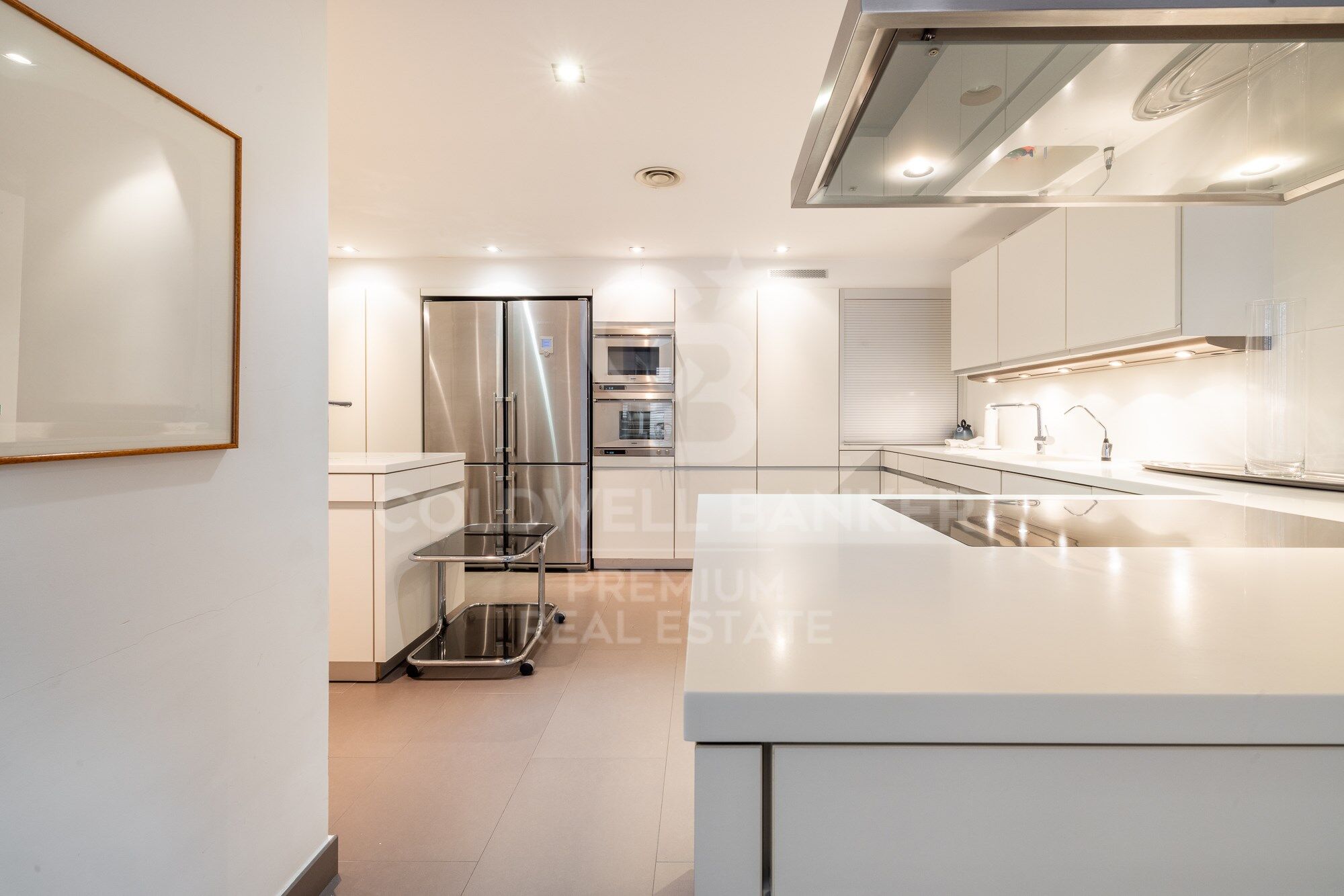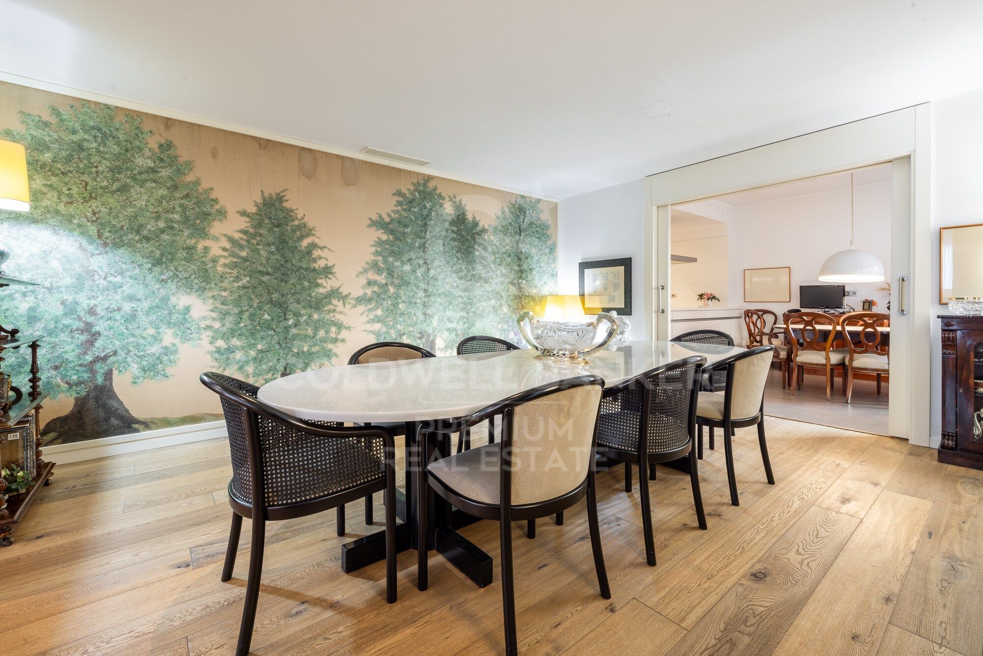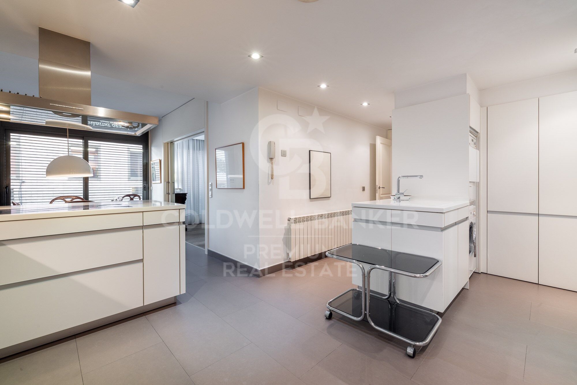 Through a circular layout we reach the beautiful dining room, undoubtedly one of the stars of the house, where the most intimate lunches and dinners can be held. The space is equipped with sliding doors to make it completely independent from the neighbouring rooms. We continue and arrive at the kitchen, divided into two spaces, on one side we find the office that functions as a newspaper dining room or as a meeting area for cocktails, aperitifs or brunches. On the other hand, we find the cooking area, which has a large work surface, a large storage area, a water and ironing area. The whole space is visually connected because there are no separating walls. But the layout of the kitchen itself prevents it from being totally exposed to the dining room or the living room.