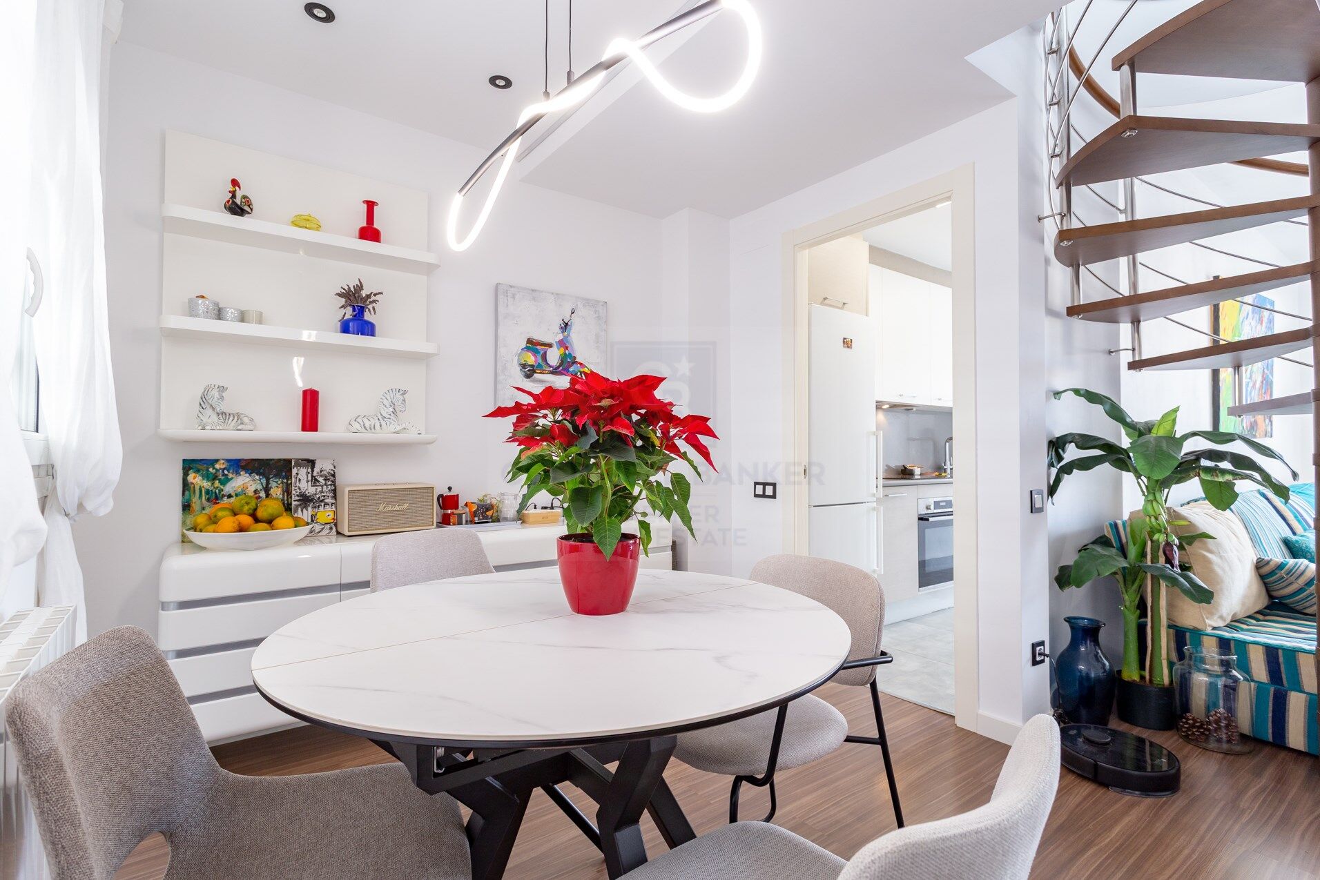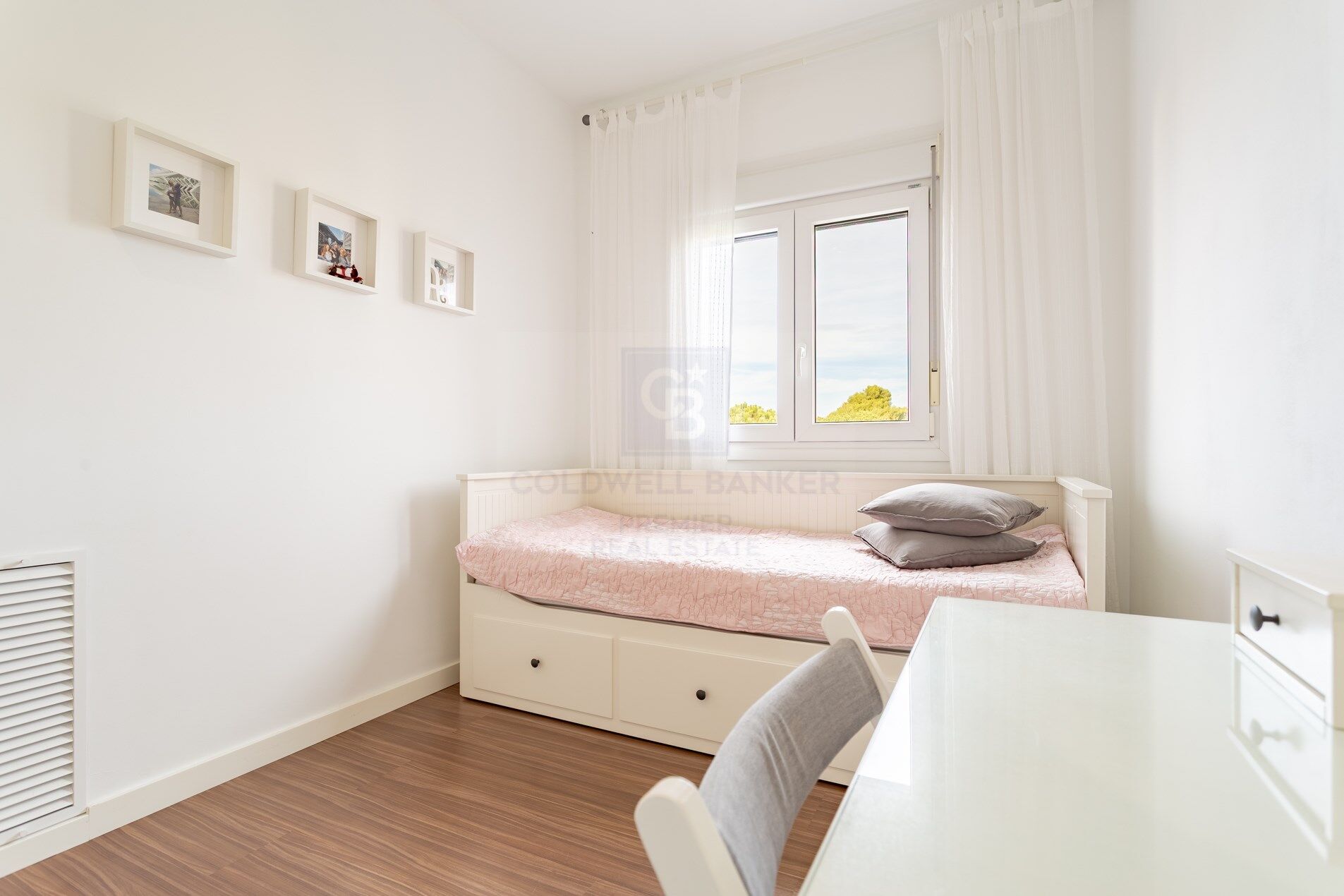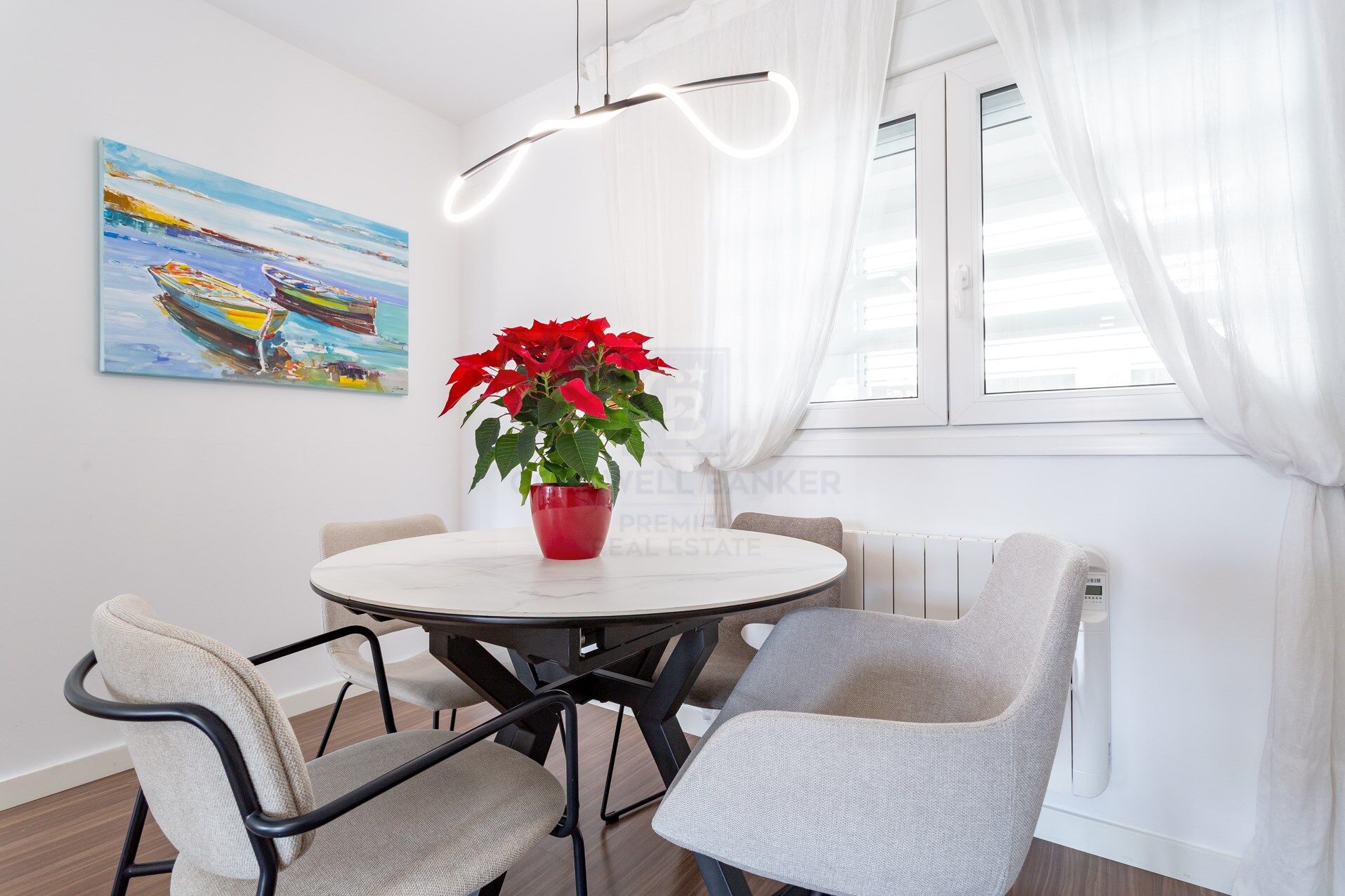 The kitchen, independent, modern and functional, offers a layout designed for everyday use, with quality finishes and a timeless style. The night area is made up of three well-lit and ventilated rooms, thanks to the fantastic orientation of the house. The master bedroom has an en-suite bathroom, while the other two bedrooms share a second full bathroom. The materials used, the neutral tones and the general quality of the finishes reinforce the feeling of comfort and elegance in each room of the property.