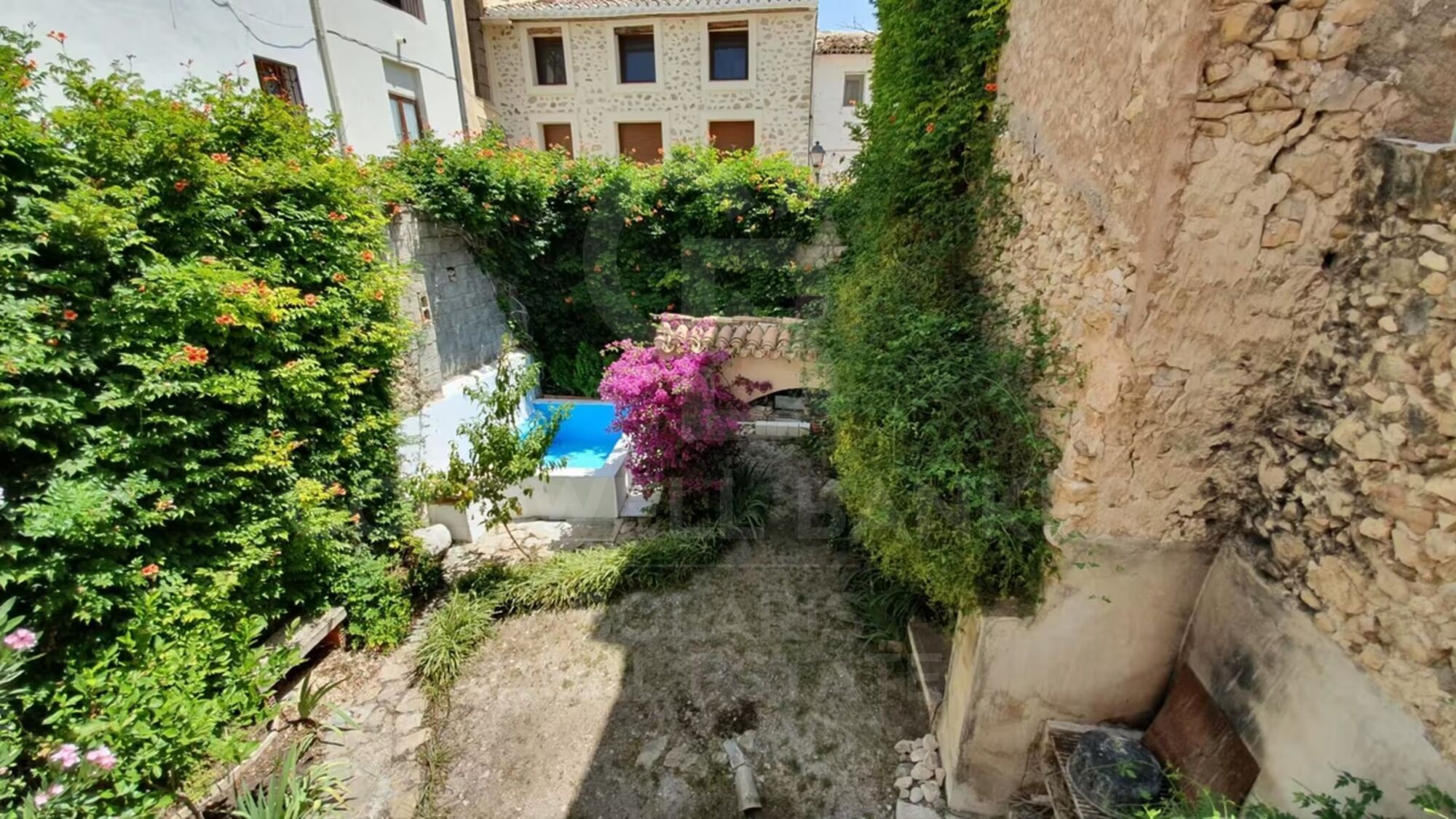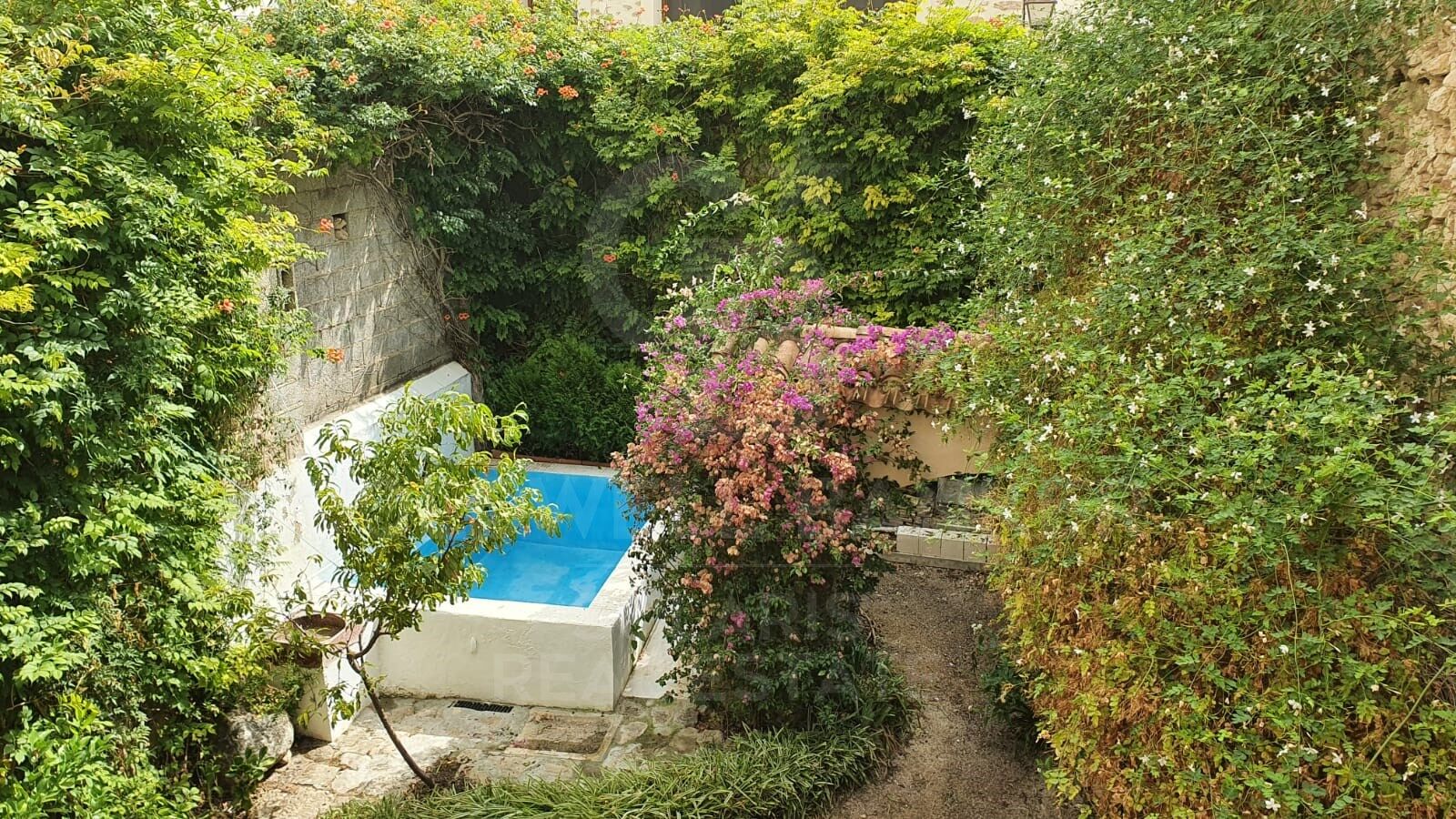 Direct exit to a large interior garden/patio of approx. 100 m², with swimming pool/raft, perfect for enjoying the outdoors and family gatherings.