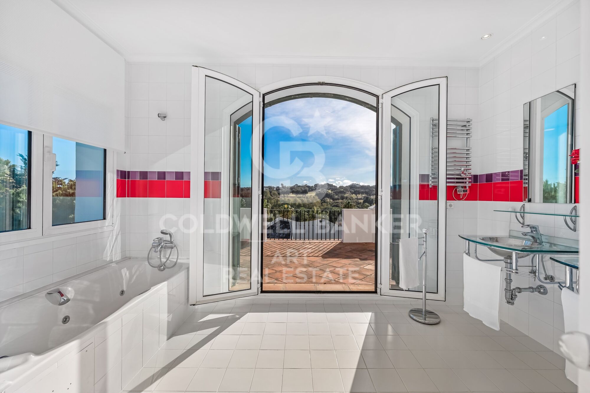 The master suite occupies its own private floor above the main level, providing a peaceful and private retreat. With high ceilings, a spacious bathroom, and direct access to a large private terrace, this suite offers elevated, open views over the surrounding greenery, creating a perfect environment for relaxation and enjoying the serenity of Sotogrande.