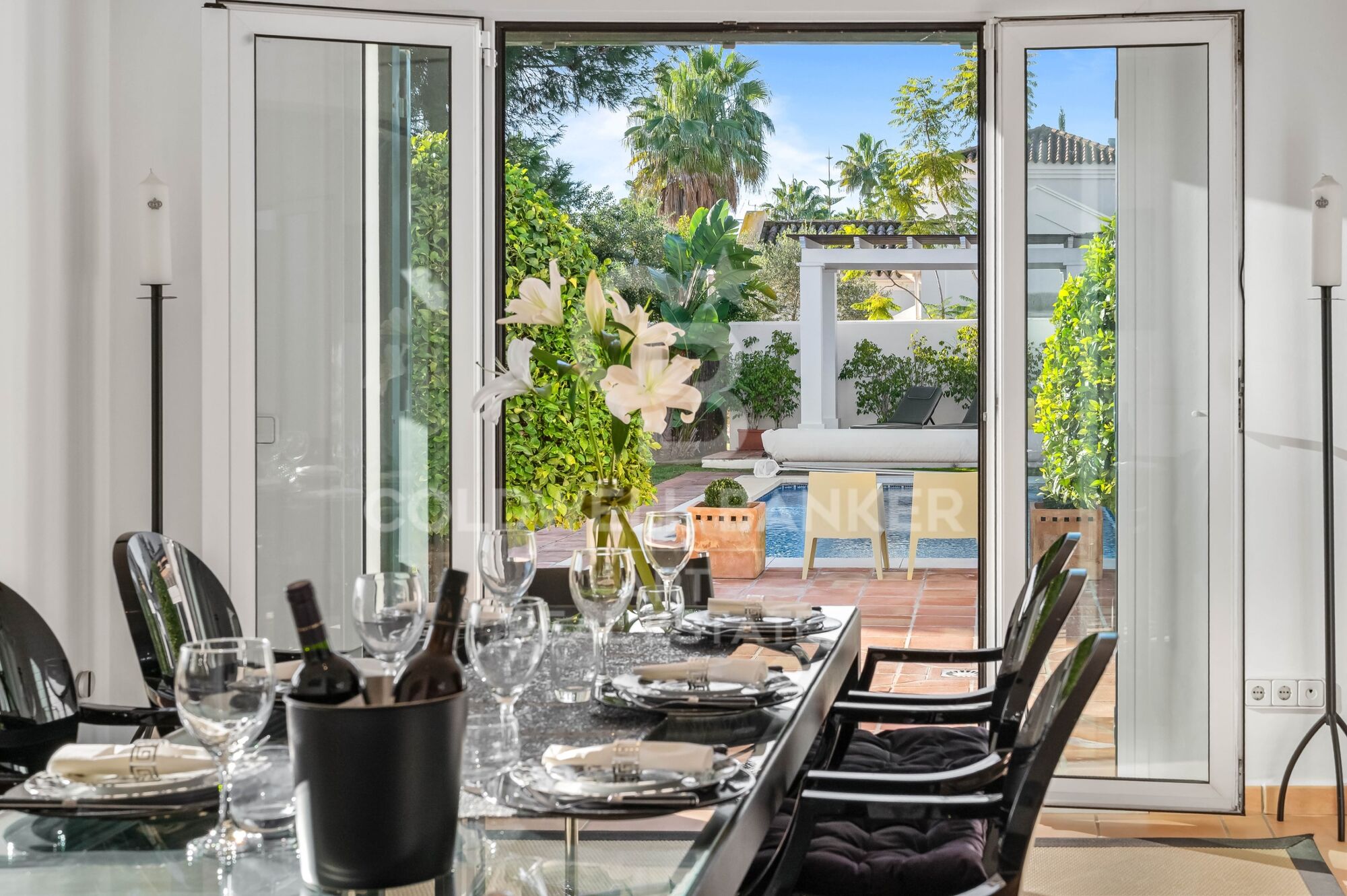 The villa enjoys a south-facing orientation, with uninterrupted open views over extensive green landscapes and three prestigious golf courses. The setting combines absolute tranquility with close proximity to all services and amenities in Sotogrande.
