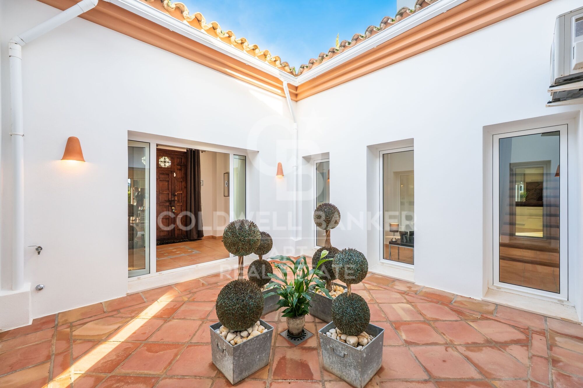 Full of charm and character, the villa impresses from the first moment, accessed via a driveway flanked by perfectly manicured hedges leading to an elegant antique wooden door. Upon entering, an impressive central courtyard organizes the entire home, flooding it with natural light and harmoniously connecting the main floor spaces. From here, views open up to the lush green surroundings of the property.