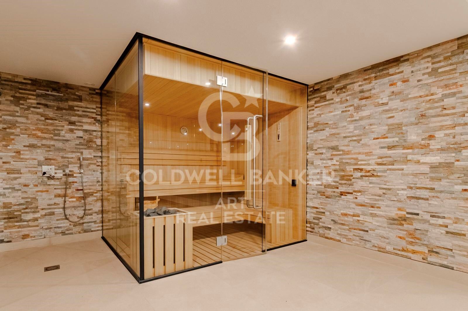 Outside, a sleek infinity pool is set amidst lush, mature gardens, evoking the tranquility of a luxury resort. A spacious private garage provides secure parking for multiple vehicles.