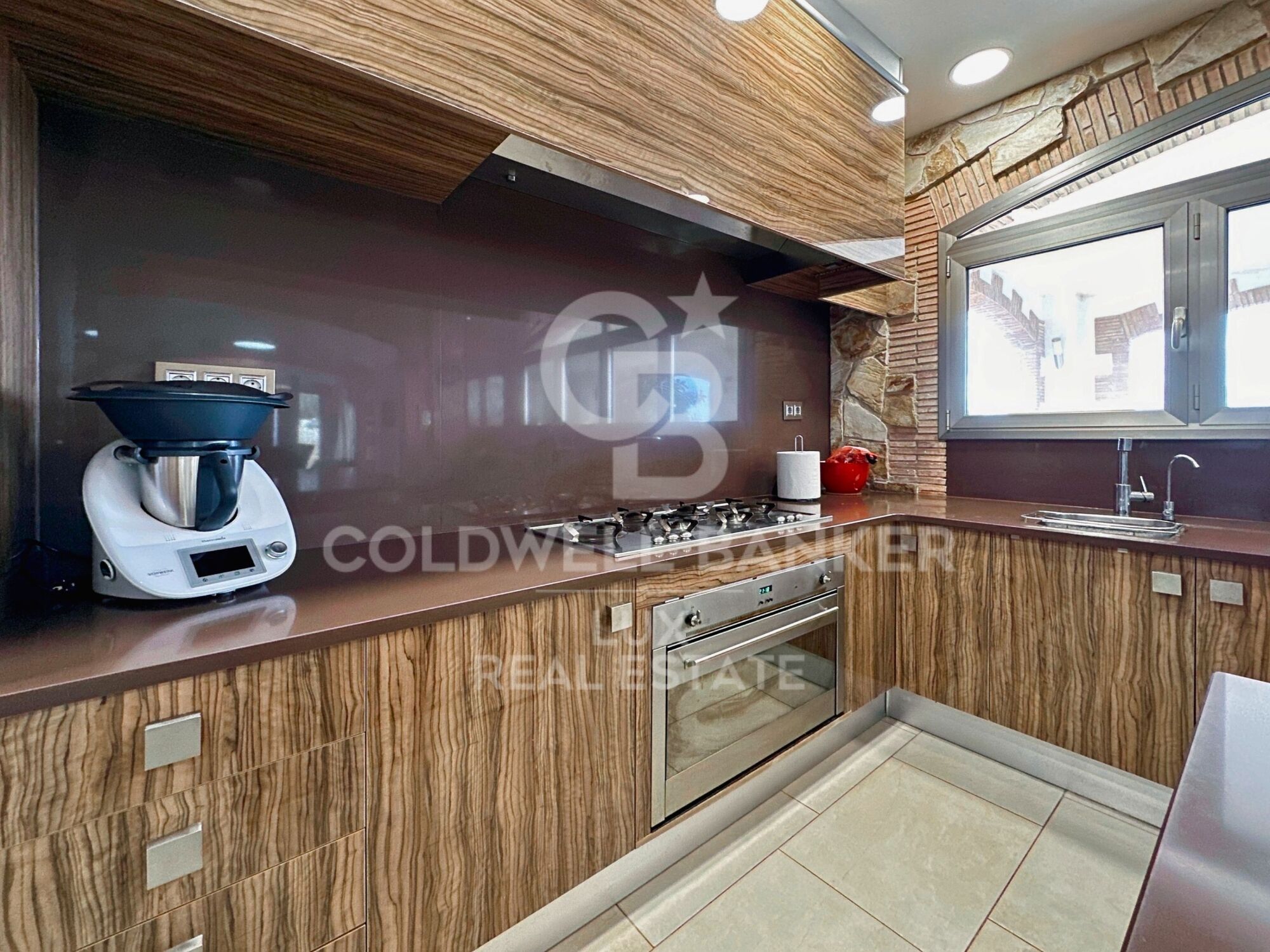 The upper floor includes a second kitchen and a living-dining room of approximately 60 m², a layout that allows independent use of each level. The bedrooms on this floor maintain panoramic sea views.