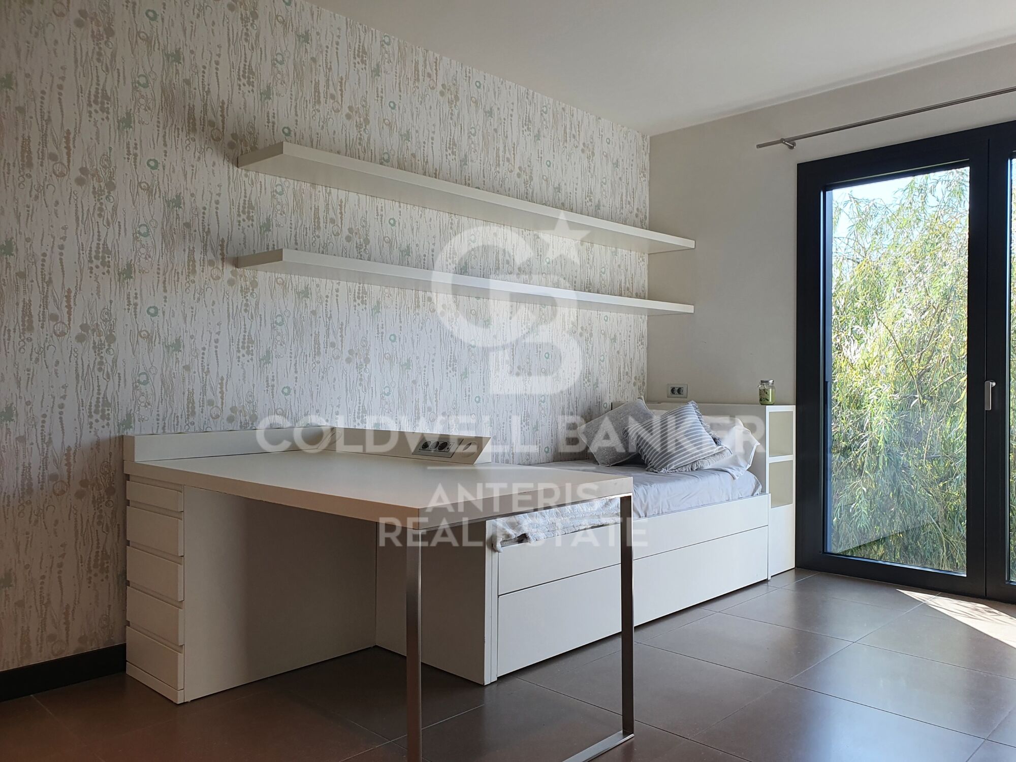En la primera planta, una imponente sala de estar-comedor de doble altura con chimenea de gas crea un ambiente acogedor y elegante. La cocina con isla, con acceso directo a la piscina desbordante, es un lugar perfecto para la creatividad culinaria. La zona de noche, separada de la zona de día garantizando la comodidad y privacidad, ofrece tres dormitorios dobles en suite, una habitación de juegos con baño y la máster suite con vestidor y jacuzzi, con acceso directo a la piscina y amplios ventanales con vistas a Barcelona.