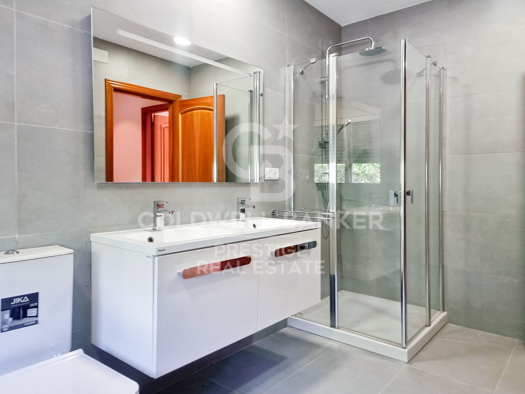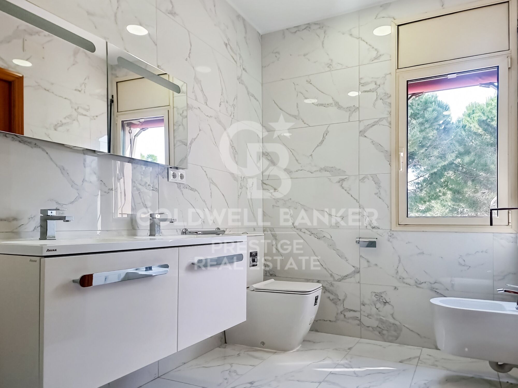Una funcional y acogedora cocina office con salida al exterior en la que situamos la increíble terraza con amplio jardín que rodea toda la vivienda, barbacoa y la preciosa piscina. Al mismo nivel zona de aguas y de servicio, también comunicado con la zona exterior.