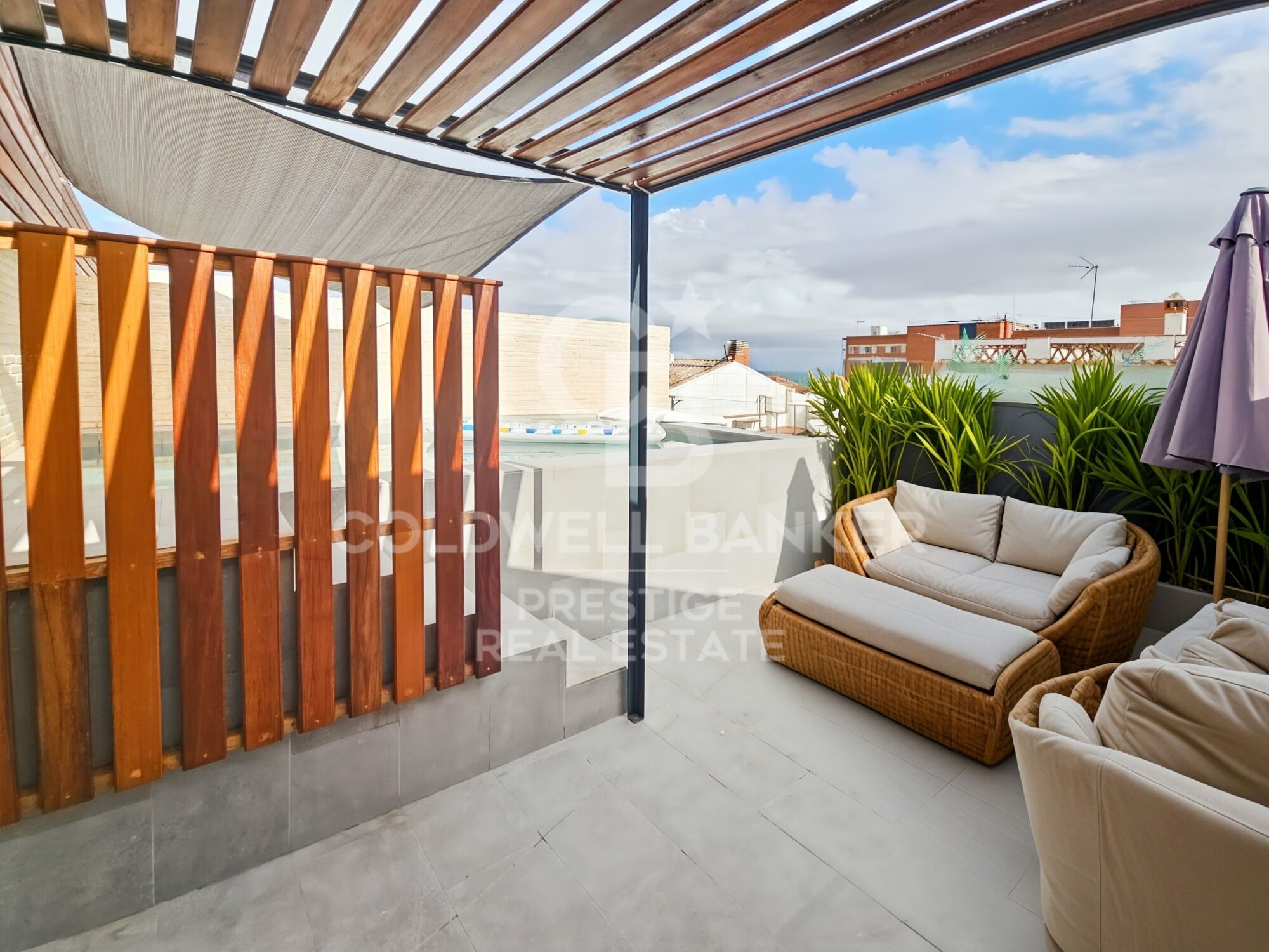 Segunda planta (bajo cubierta): Sala polivalente actualmente utilizada como espacio de música y televisión, con acceso directo a una amplia terraza privada que cuenta con piscina. Un espacio exterior que ofrece privacidad y vistas despejadas.