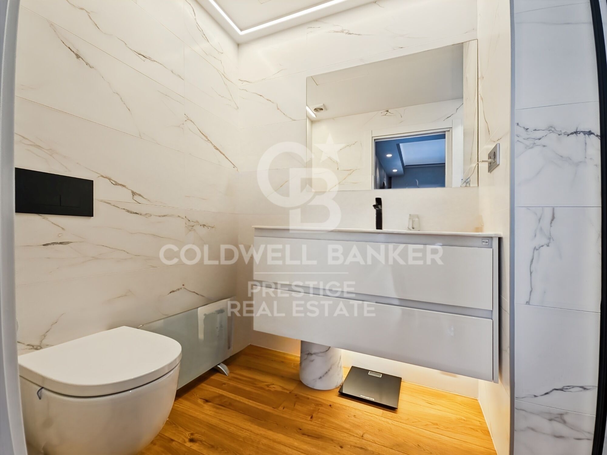 Suelo de parquet flotante de madera natural (gres porcelánico en garaje y terrazas)