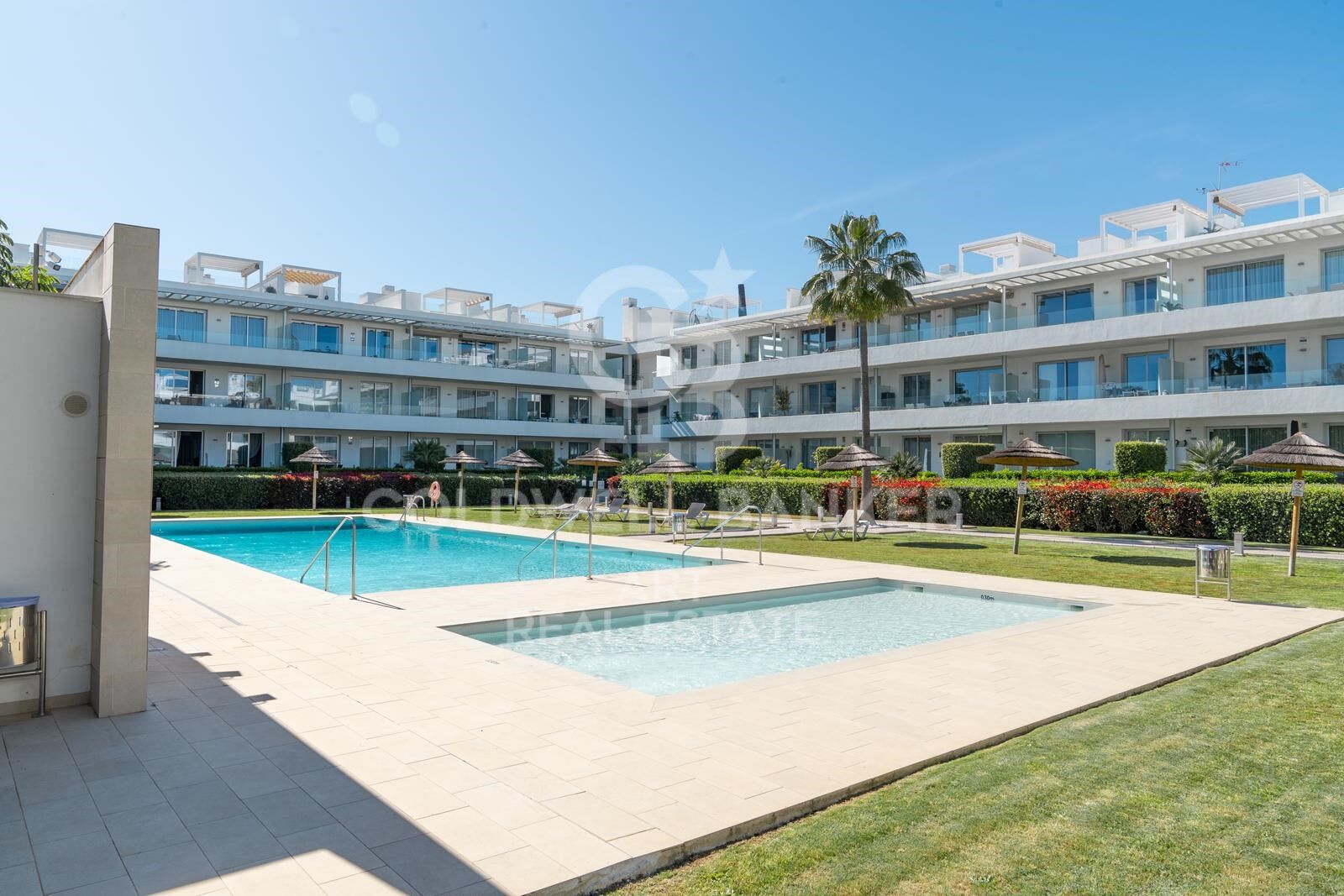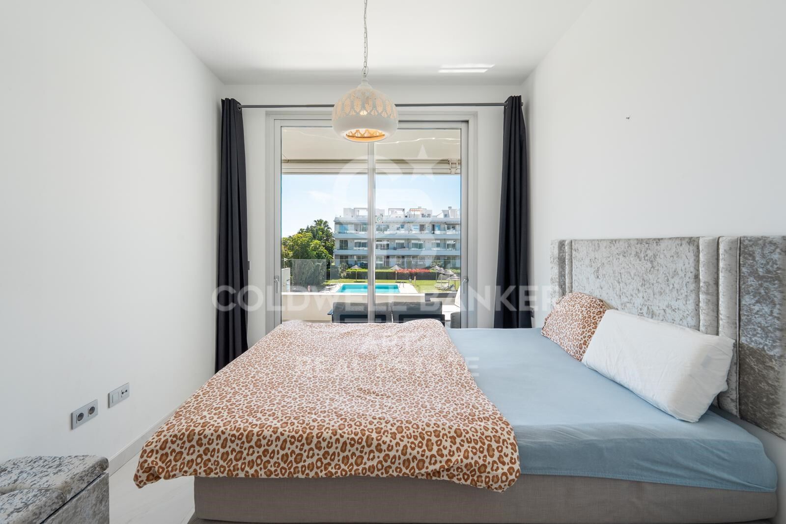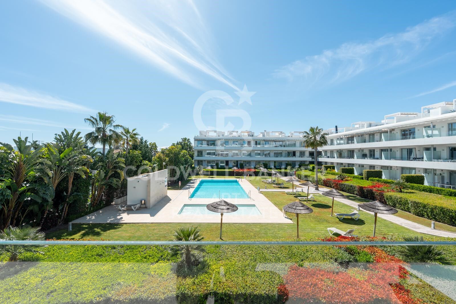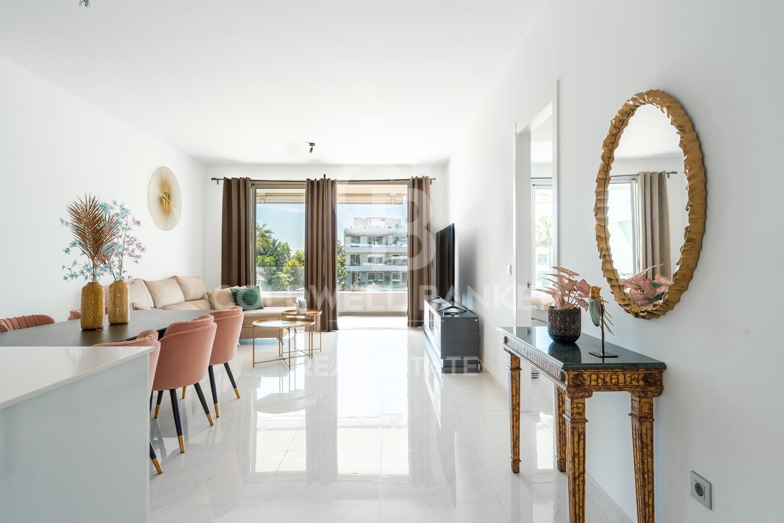 Luminoso, espacioso y con una ubicación inmejorable, este moderno apartamento de 2 dormitorios y 2 baños se encuentra en la codiciada zona de Bel-Air, en pleno corazón de la Nueva Milla de Oro. El dormitorio principal dispone de baño en suite y acceso directo a una amplia terraza de 21 m² con vistas a la cuidada piscina comunitaria, ideal para disfrutar del estilo de vida mediterráneo.