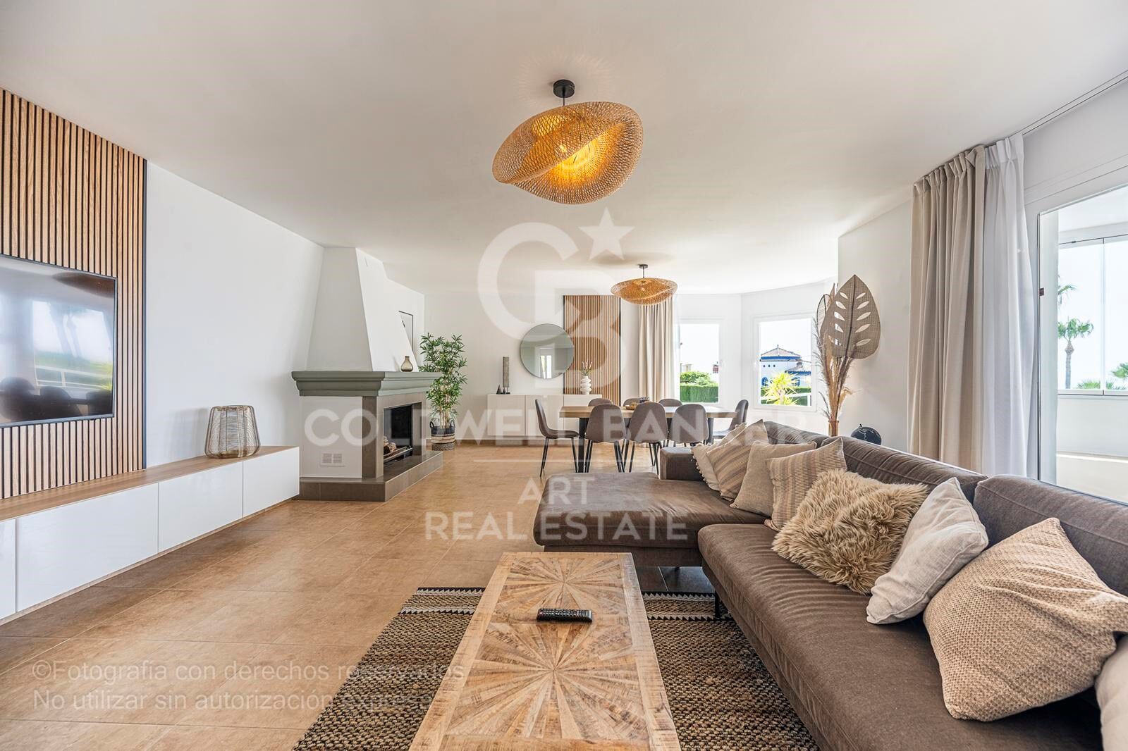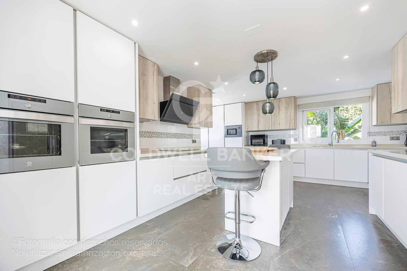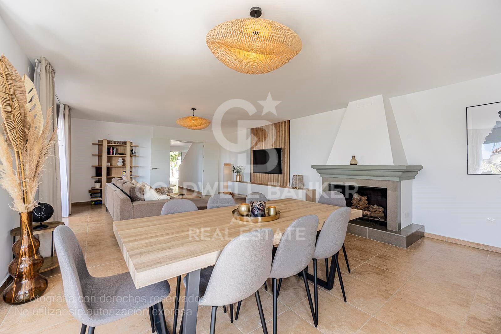 La planta principal ofrece una sala de estar luminosa y elegante con acceso directo a amplias terrazas, perfecta para disfrutar del sol y el estilo de vida al aire libre. Una cocina moderna y totalmente equipada se integra maravillosamente con el diseño general de la casa, mientras que en el exterior encontrará una gran piscina, zona de barbacoa y jardines meticulosamente cuidados.