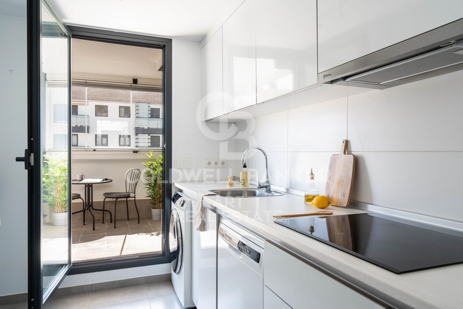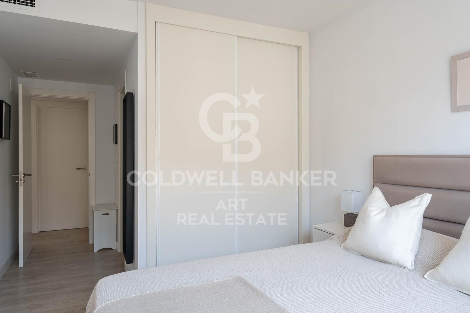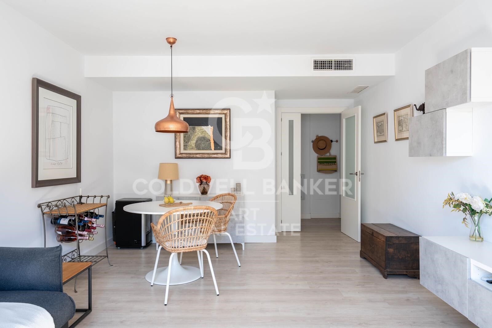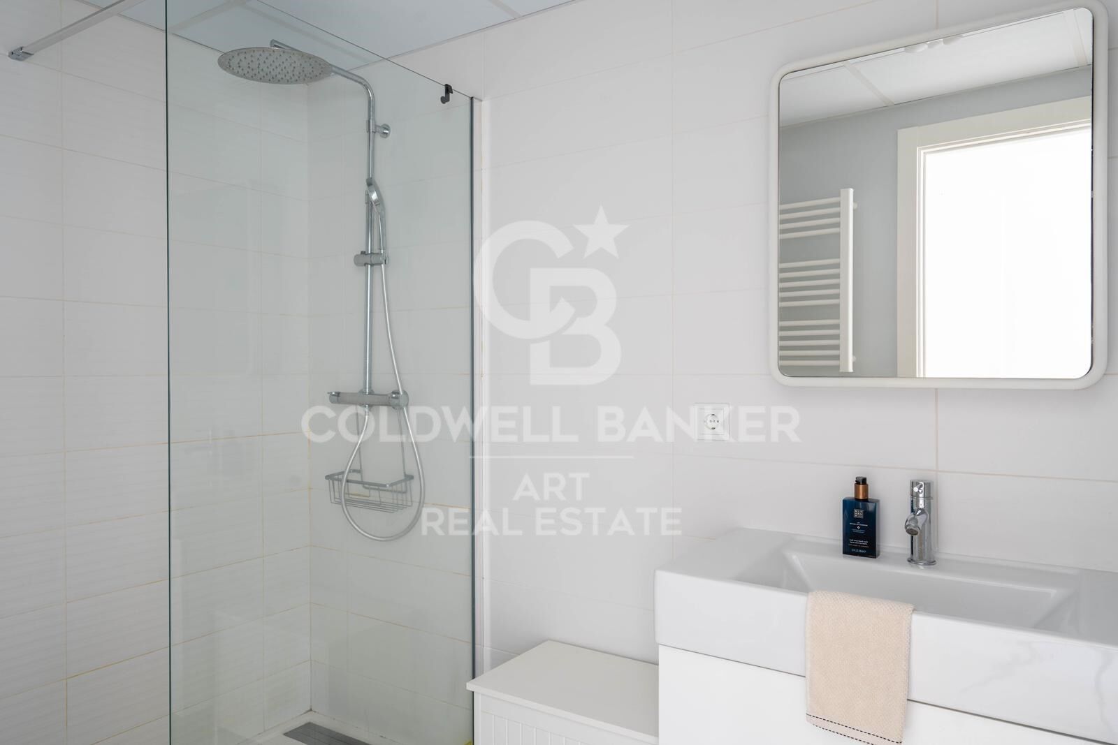 El interior presenta suelos de madera y baldosas porcelánicas, espacios amplios y luminosos, y una cocina moderna totalmente equipada con electrodomésticos integrados. Uno de los dos baños incluye una bañera de hidromasaje. También cuenta con armarios empotrados, aire acondicionado, doble acristalamiento, garaje privado y trastero.