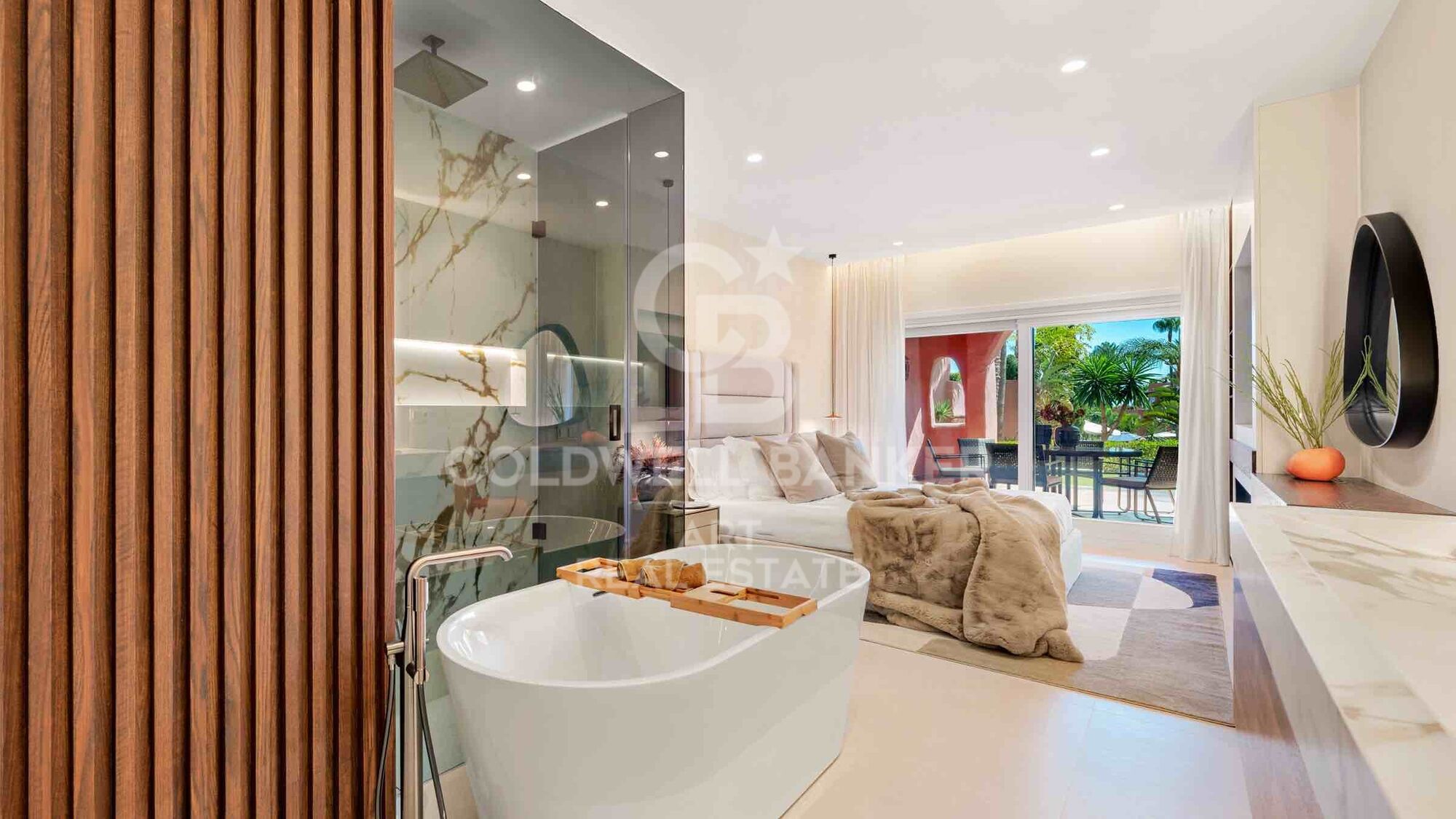 Este exclusivo apartamento en planta baja, ubicado en la prestigiosa zona de New Golden Mile, ha sido completamente renovado con los más altos estándares de calidad. Cuenta con tres dormitorios y tres baños, ofreciendo un ambiente elegante y sofisticado con vistas encantadoras a los exuberantes jardines del complejo.