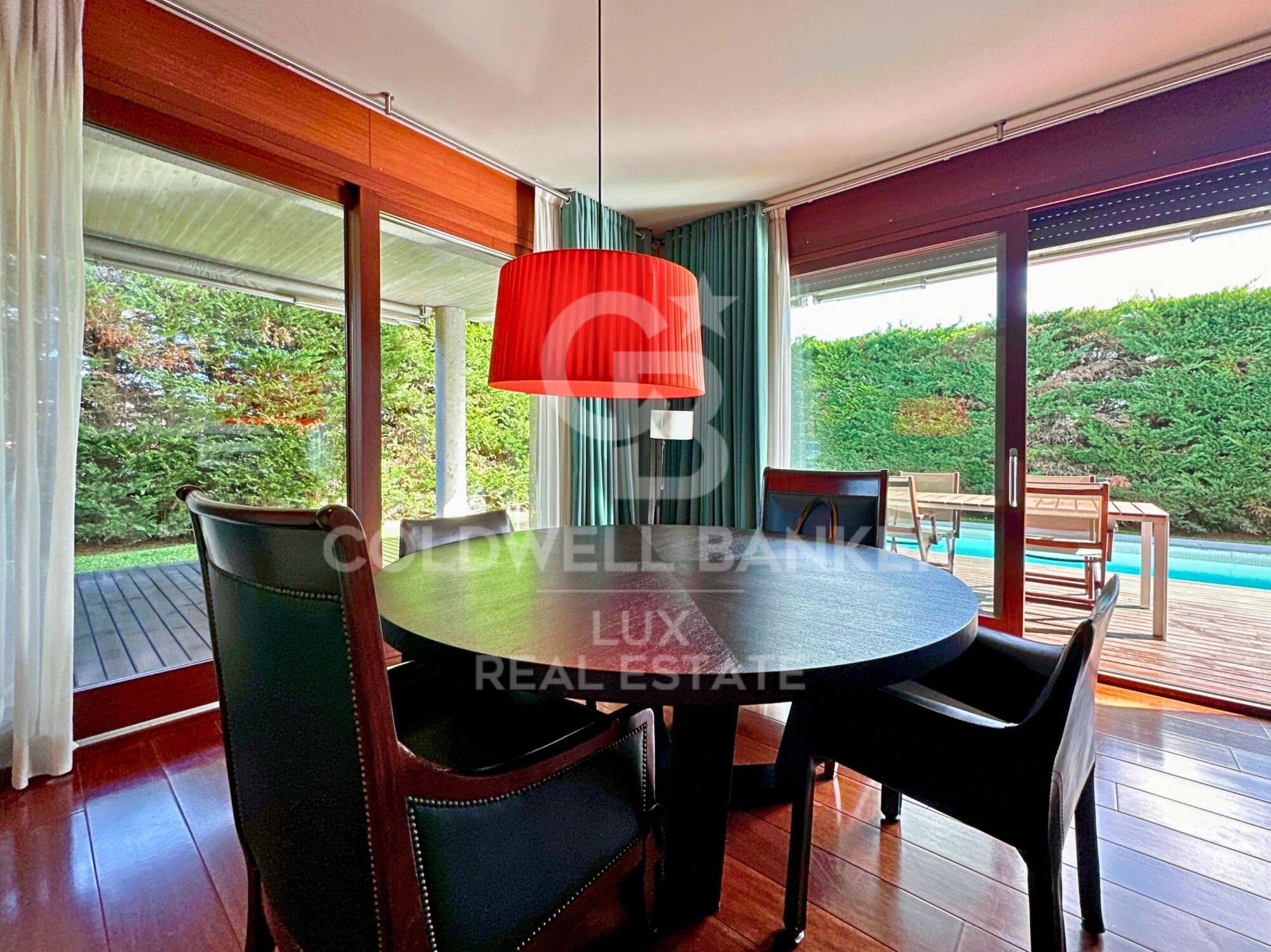 El jardín exterior rodea la propiedad, con mucha vegetación y una piscina de 17,5 metros.