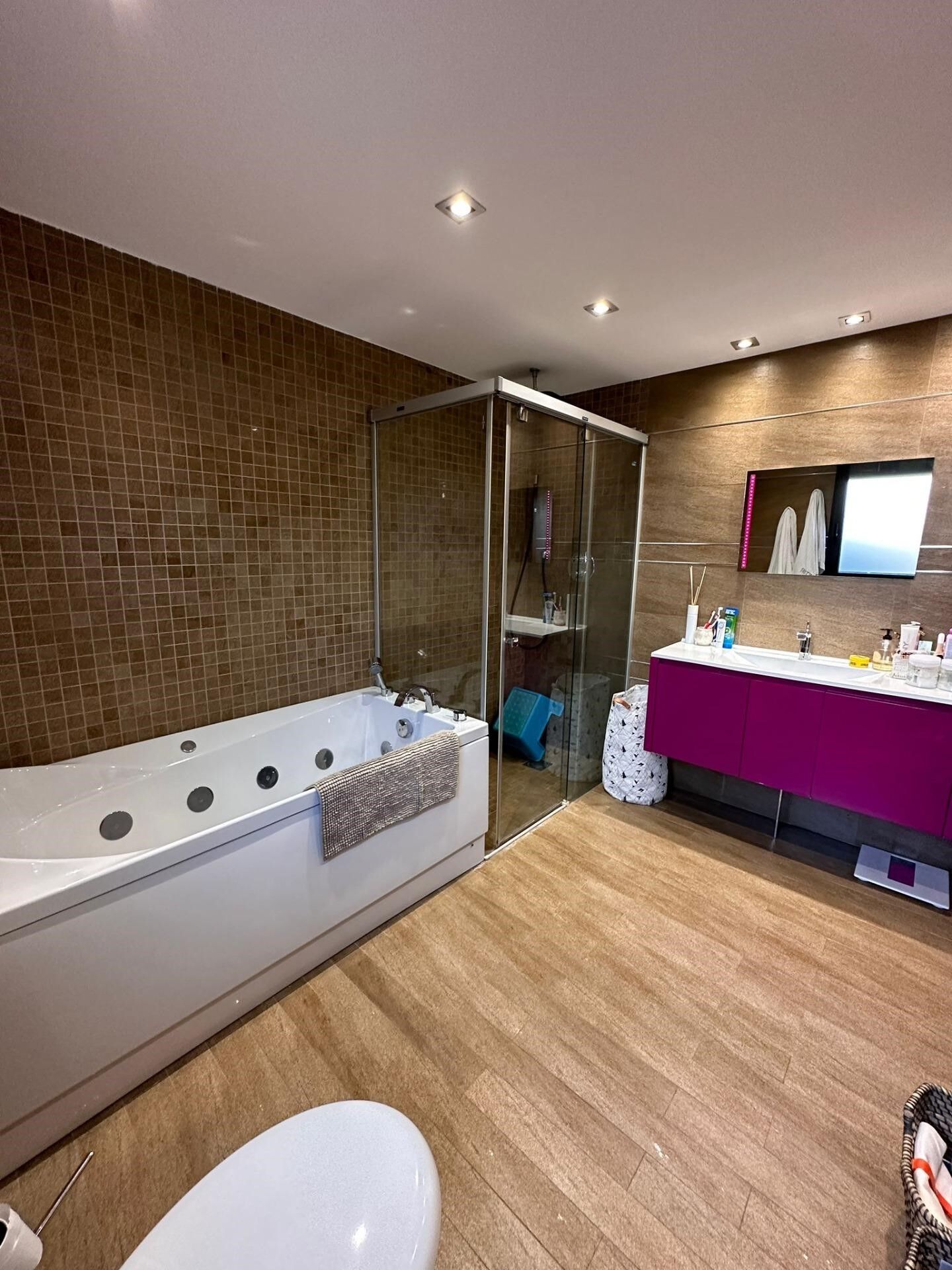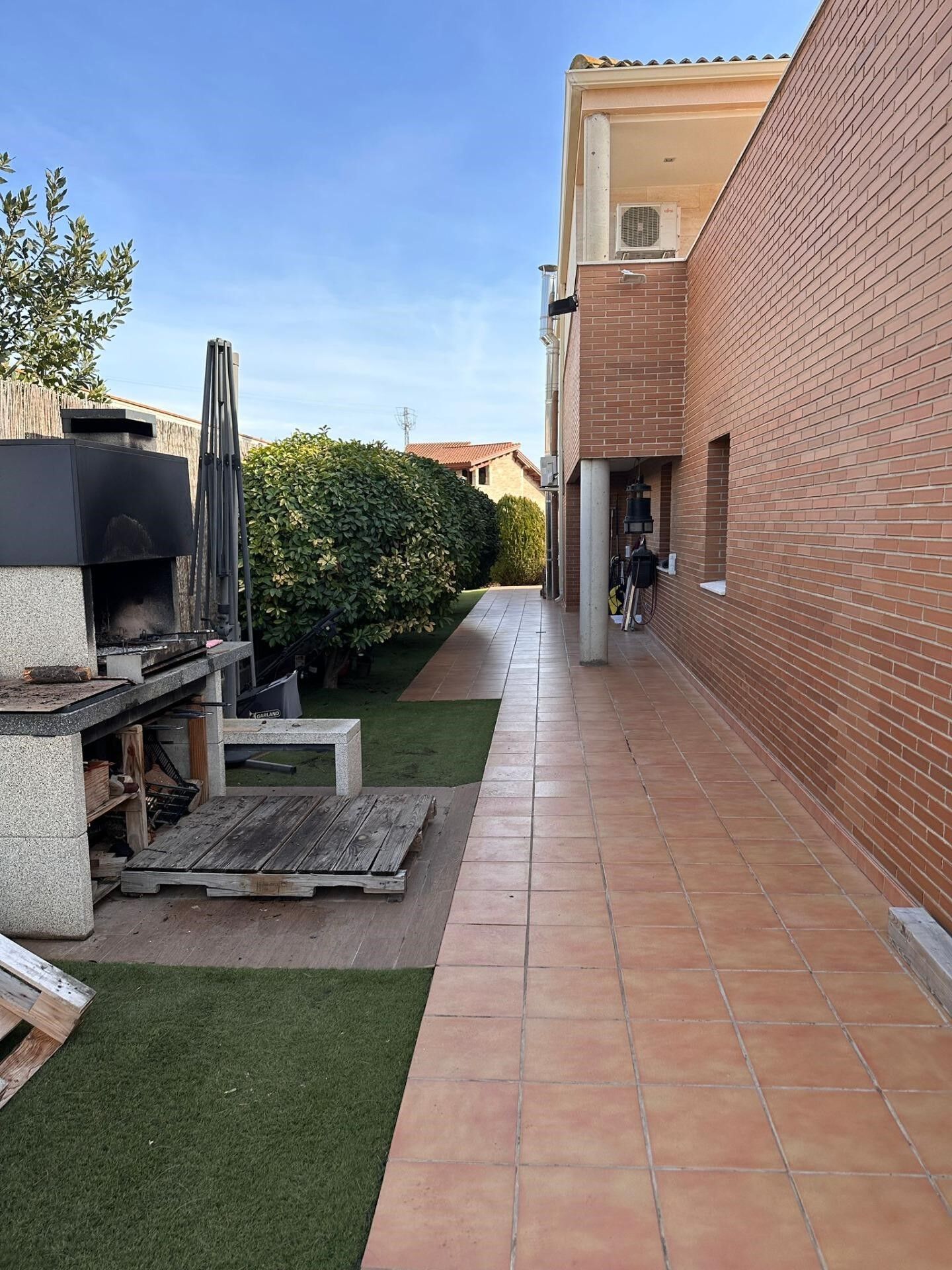 Chalet avec terrain de 950m2. Elle se compose de 3 étages avec un beau jardin et une piscine.~Sous-sol avec parking, salle polyvalente et chambre avec salle de bain.~Rez-de-chaussée très spacieux avec cuisine, salle à manger, cellier et lave-linge.~* Chambre 1 de 18m2 plus WC,~*chambre double 2 de 15m2 plus dressing et WC~* chambre 3 de 12m2 avec bureau.~Toutes les chambres ont des armoires encastrées.~Premier étage avec deux pièces de 20m2 chacune et une terrasse extérieure de 50m2.