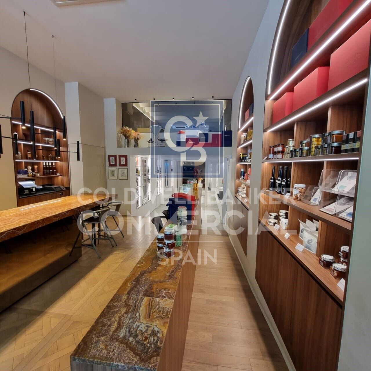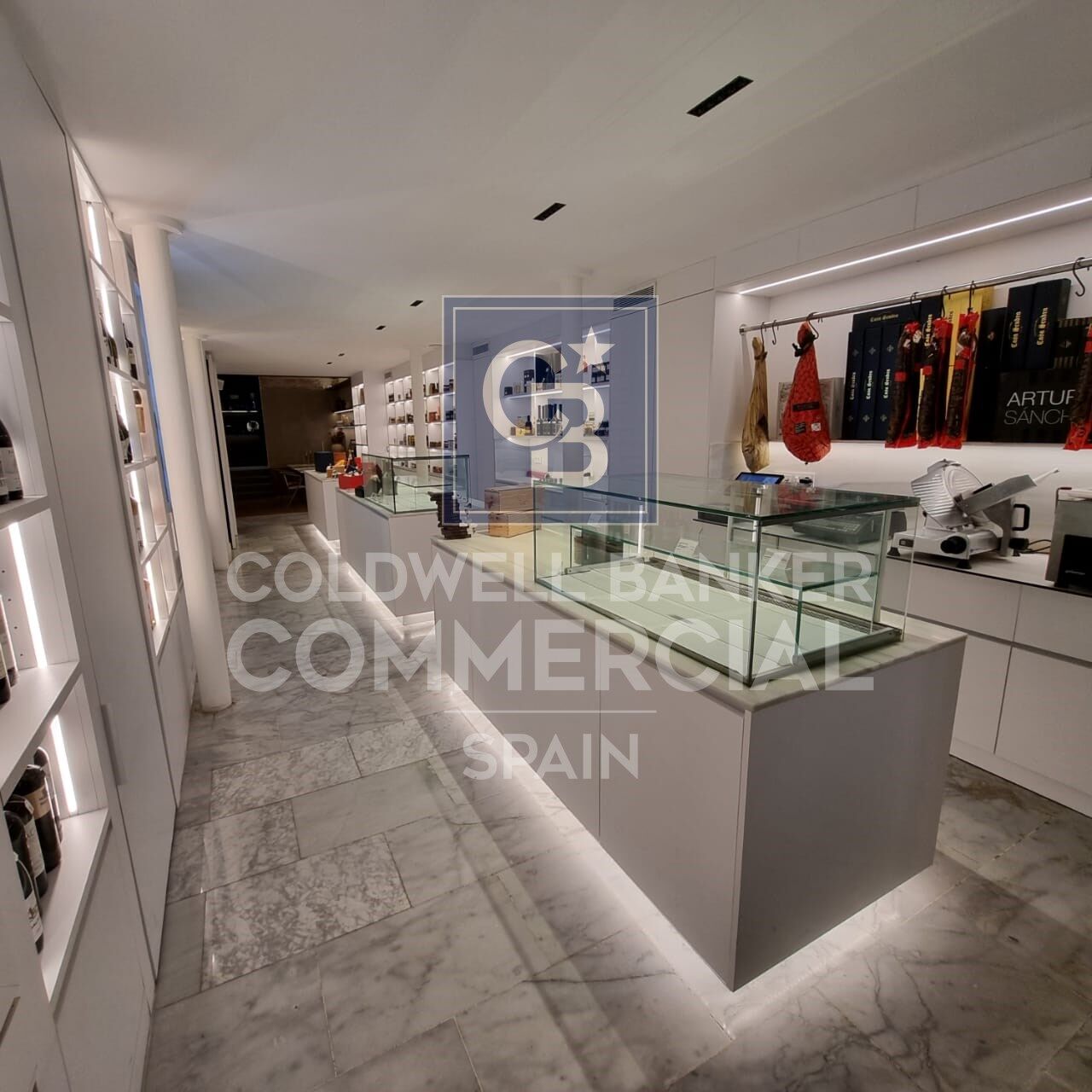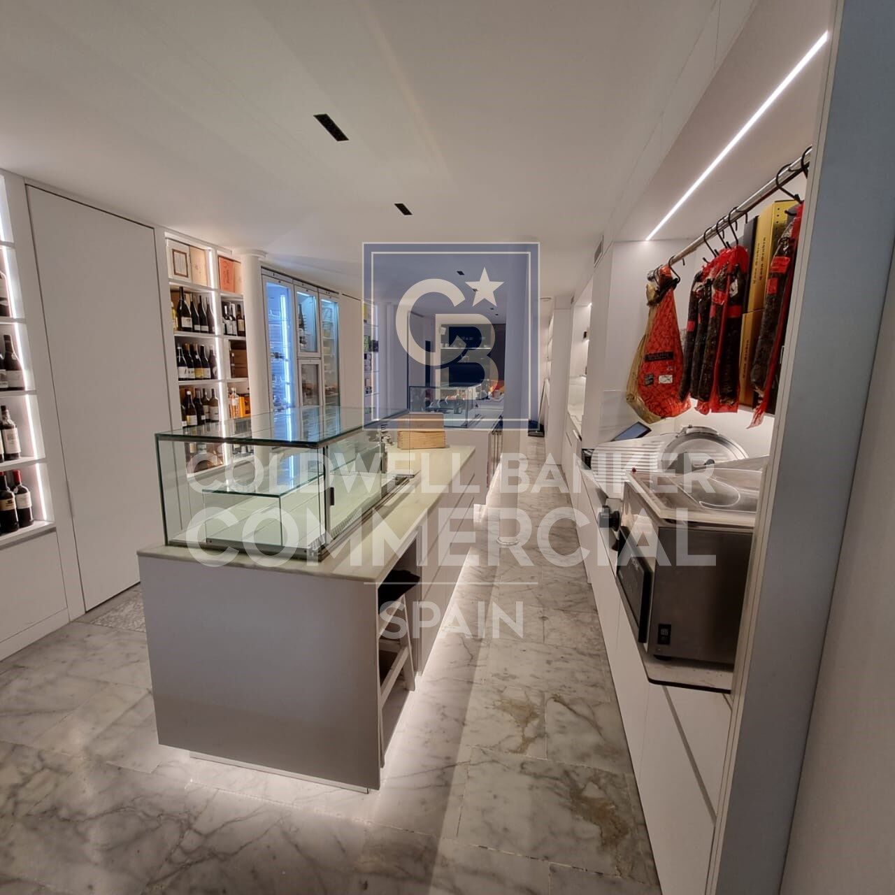 - Exhibition Area: White Macael marble area with three central islands for displaying sausages and cheeses. Wine cellar with cold wine cellar and shelves full of products for sale.