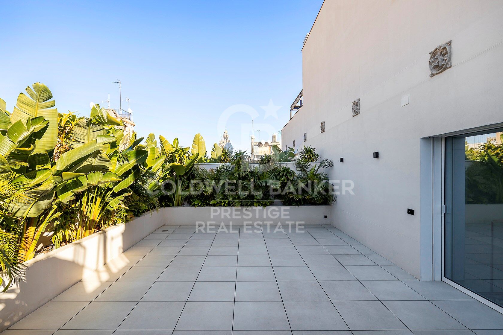 Coldwell Banker Anteris presents this fantastic renovated penthouse with a private rooftop terrace, located on one of the most sought-after and quiet streets in the neighborhood, surrounded by shops and all kinds of services. Located on the top floor of a classic 1900s building with an elevator, this bright apartment offers 131 m² of floor space plus 41 m² of private terrace, with a layout designed for comfort, natural light, and elegance. The high ceilings and wooden beams add warmth and character, while the natural parquet floors and exterior woodwork ensure comfort and style. The living-dining room stands out for its spaciousness and brightness thanks to its four balconies, and the open-plan kitchen is fully equipped with built-in appliances and a small wine cooler. All this with the added character provided by the wooden beams on the ceiling. The sleeping area includes a double bedroom with en-suite bathroom and the master bedroom with en-suite bathroom, dressing room, and an exterior balcony with morning light. In addition, there is an architect's plan to convert the property into three bedrooms, providing flexibility for future owners. Its features include renovated facilities, ducted air conditioning, wooden beamed ceilings, natural parquet flooring, and double-glazed exterior windows, ensuring comfort, efficiency, and style. Thanks to its privileged location, just a few steps from shops, cafes, local markets, and public transportation, this penthouse is ideal both as a ready-to-move-in home and as an excellent investment in a well-established neighborhood with high demand in Barcelona. A home with light, design, and character that combines the exclusivity of a private terrace with the convenience of living in the heart of the city. Contact us and schedule your visit! #ref:AV255