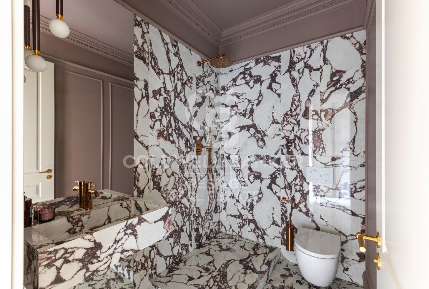La restauration a mis en valeur des matériaux sélectionnés : planchers en chêne français à chevrons, corniches en plâtre modelées à la main et marbre naturel. L'éclairage indirect met en valeur les plafonds finement travaillés, accentuant la hauteur et la richesse des détails architecturaux.