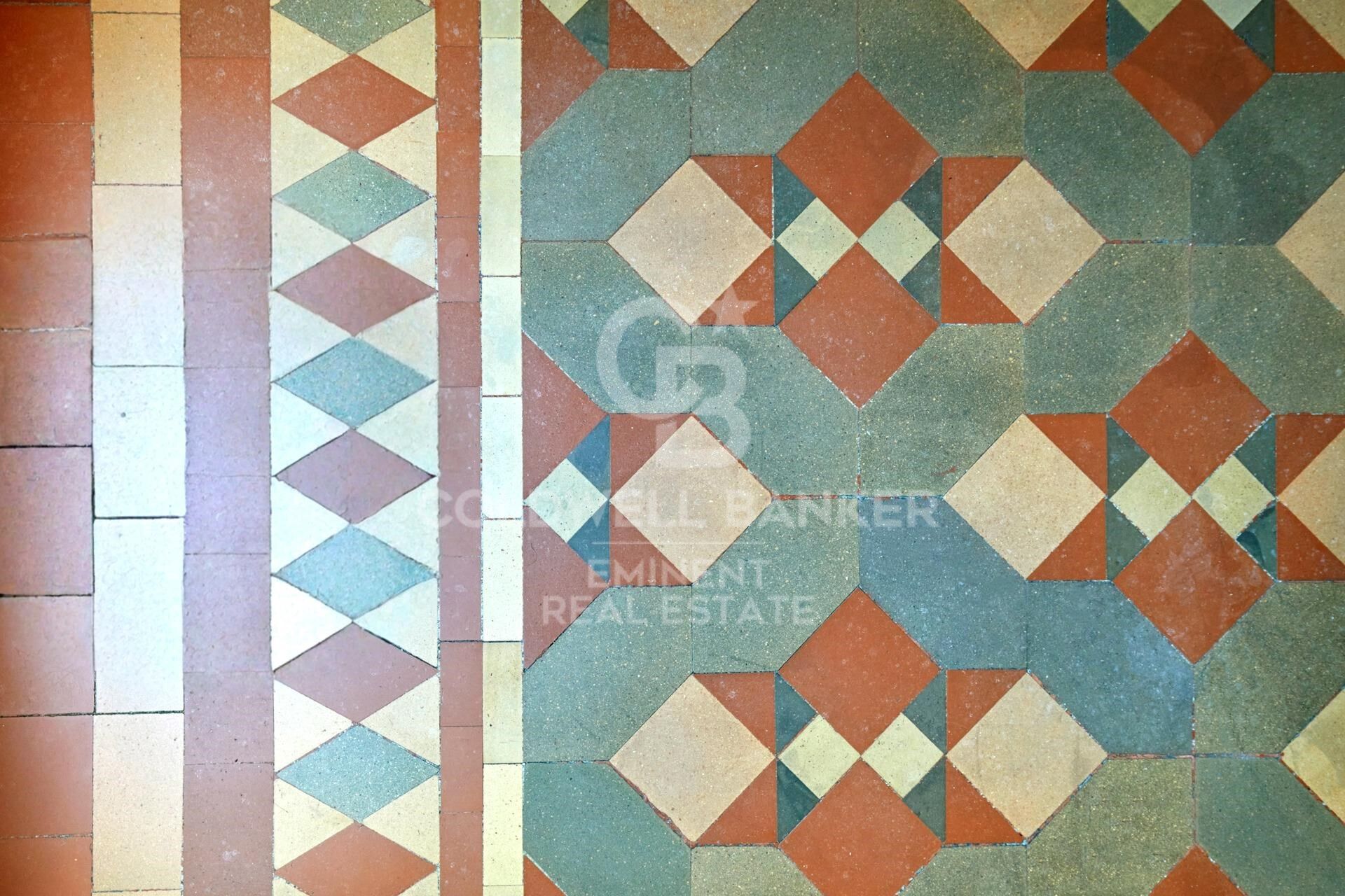 Sols en mosaïque hydraulique restaurés, riches de détails historiques.