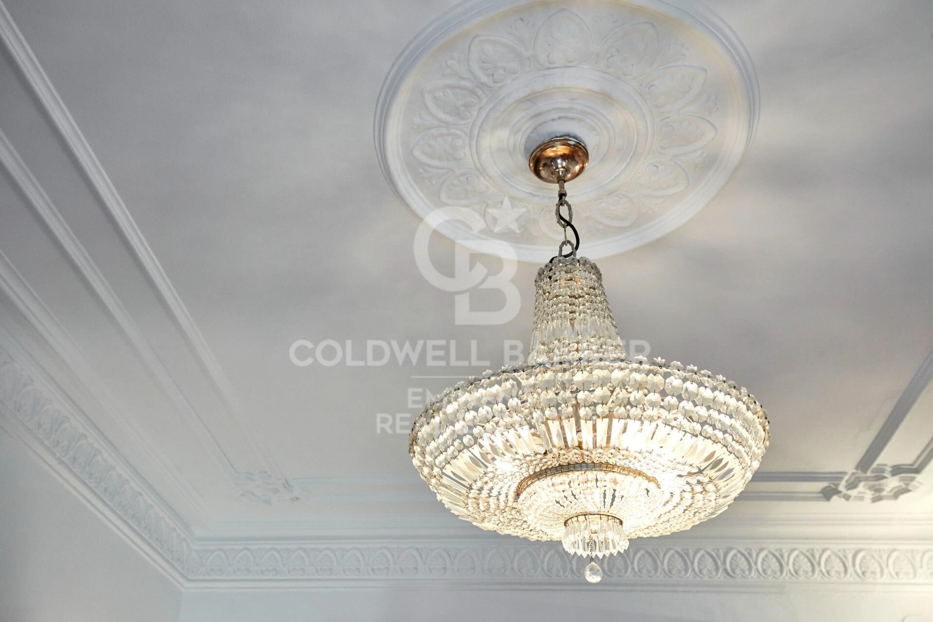 Hauts plafonds avec moulures à caissons d'origine, typiques de l'architecture moderniste.