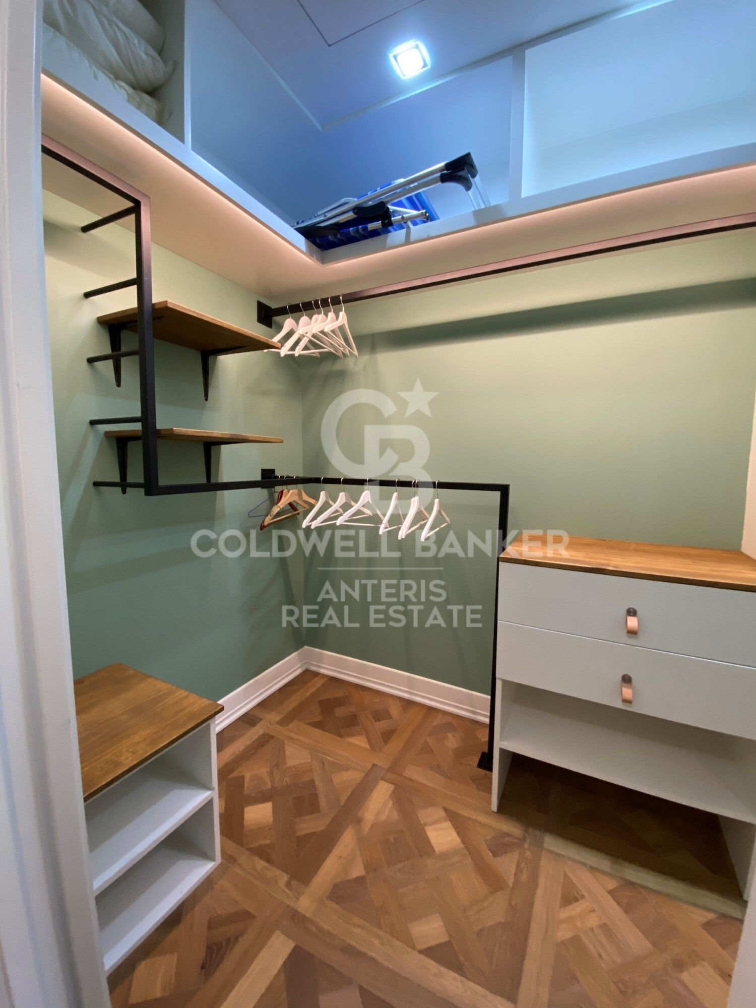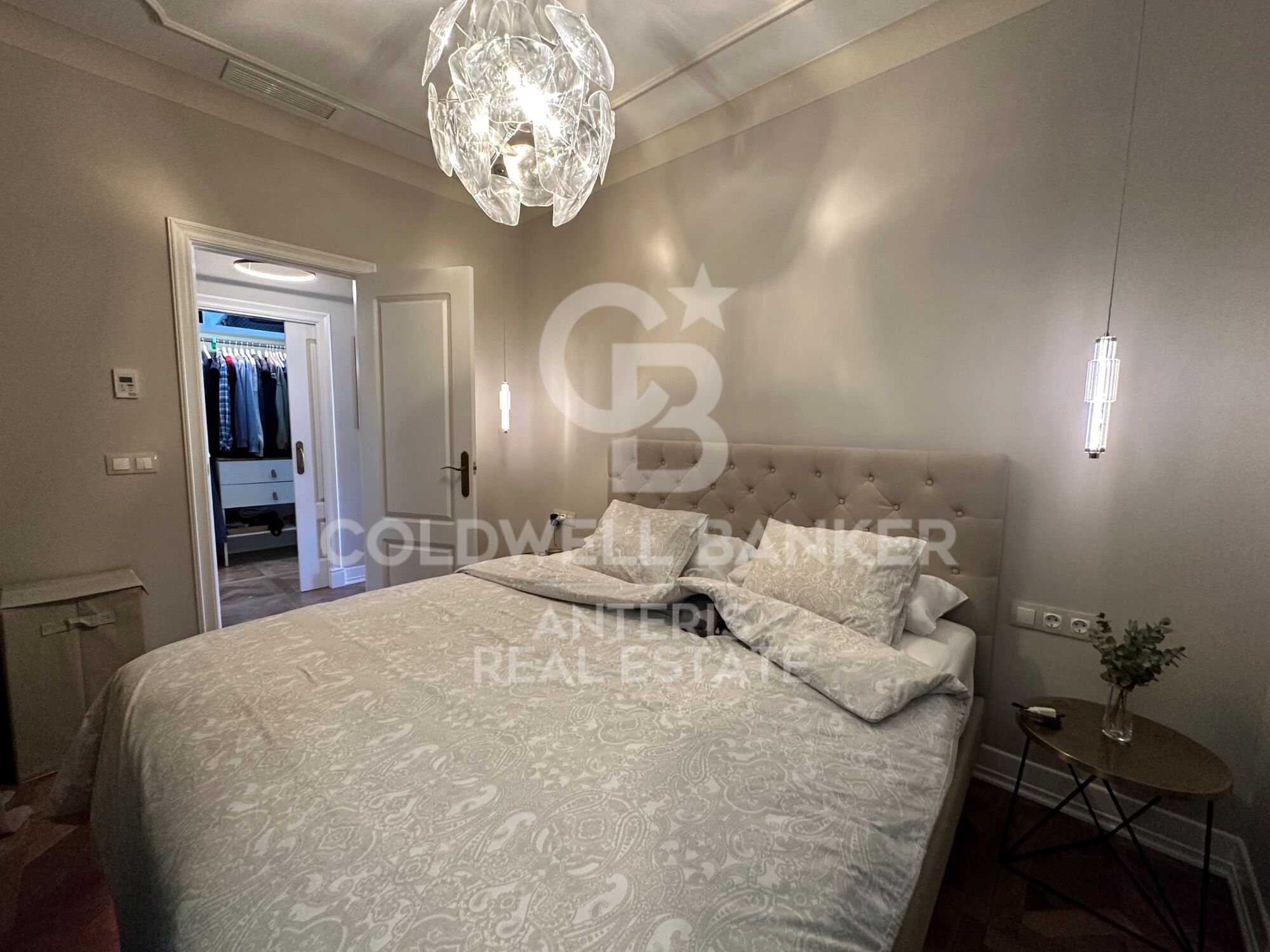 The apartment features two bedroomsone double and one medium-sizedtwo full bathrooms, and a bright living-dining area with an open-plan kitchen and access to two balconies overlooking the street. The high-quality renovation includes natural wood parquet flooring, high ceilings, ducted hot-and-cold air conditioning, aluminum windows with triple glazing, and fully equipped kitchen. A standout feature is the spacious walk-in wardrobe, a highly valued addition.