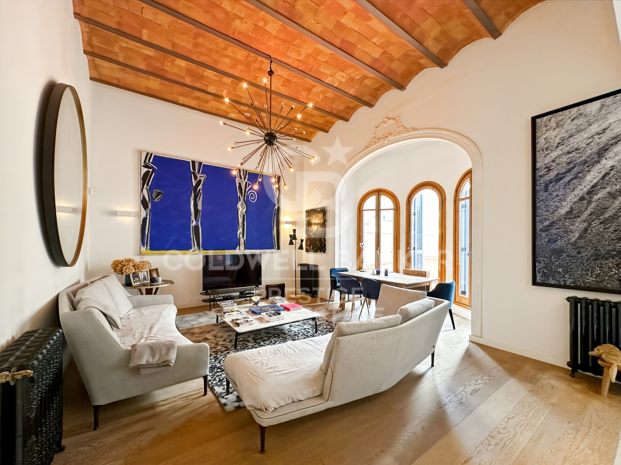 On y retrouve de magnifiques parquets mêlés à des carreaux hydrauliques d'origine et de hauts plafonds voûtés catalans, qui confèrent chaleur, amplitude et caractère à chaque pièce.