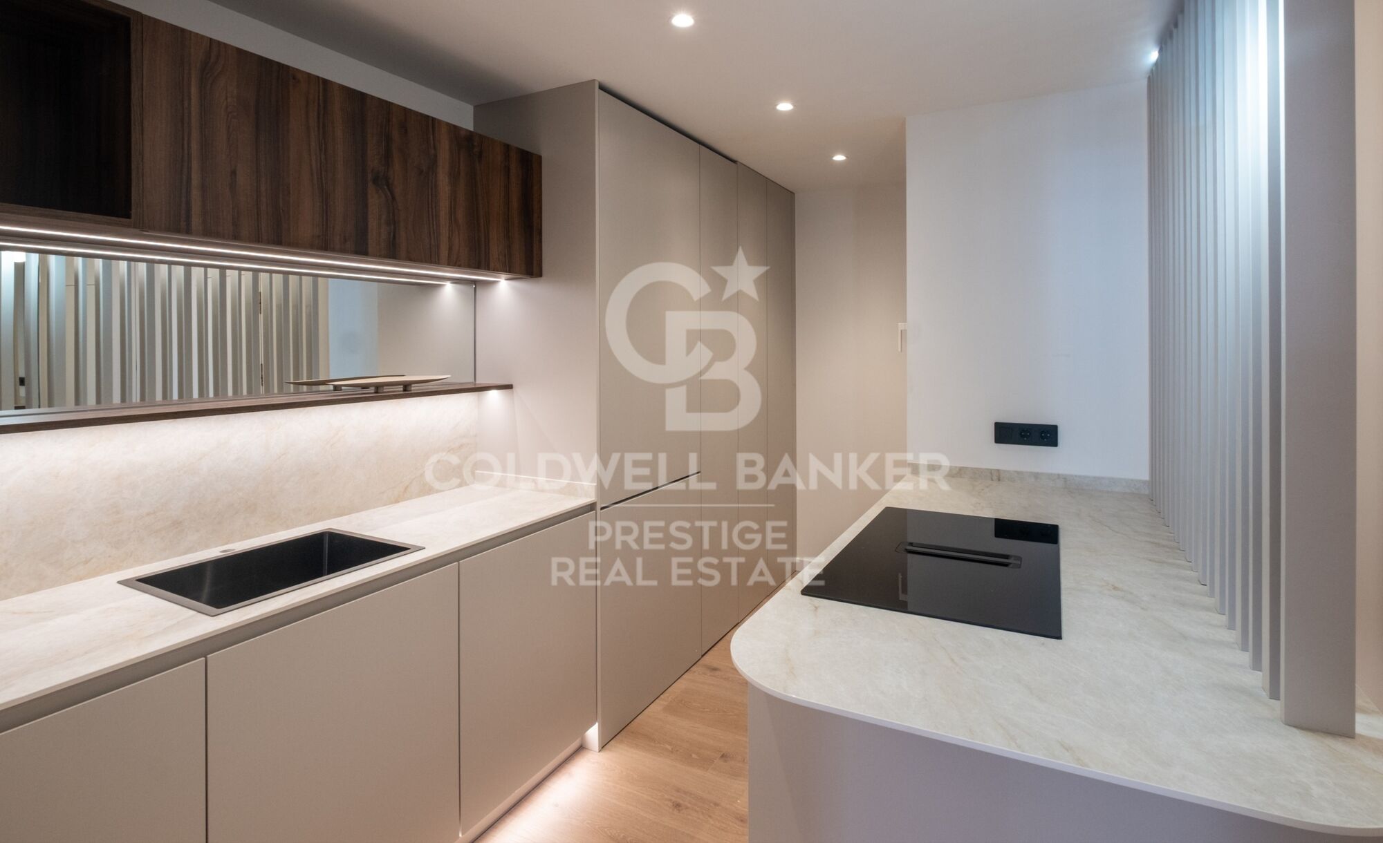 L'appartement dispose d'une cuisine ouverte de style américain, avec des finitions haut de gamme et un îlot central, conçue comme un espace idéal pour partager des moments conviviaux avec famille et amis tout en profitant du plaisir de cuisiner.