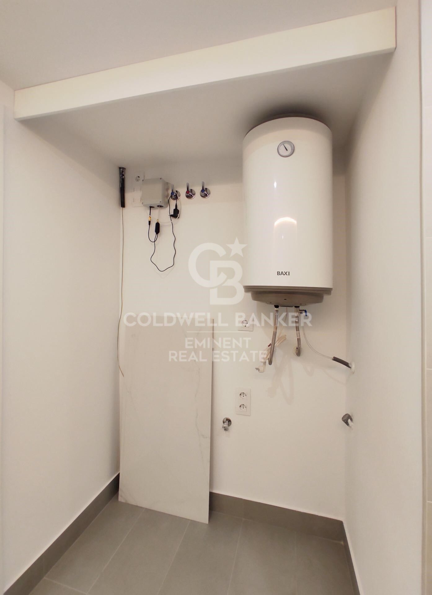 Salle de bain complète avec douche, avec pré-installation pour lave-linge/sèche-linge intégrée sans altérer l'esthétique.