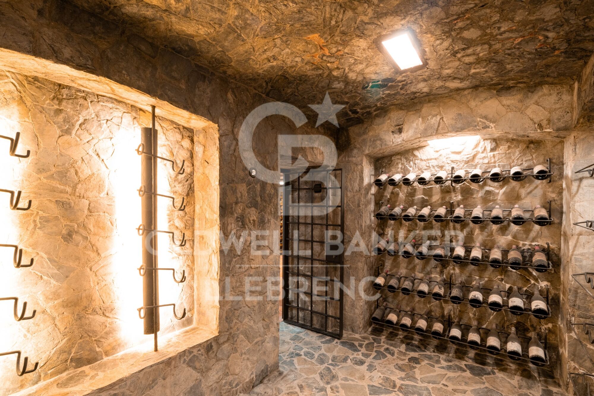 L'étage inférieur comprend deux grandes suites, une chambre double supplémentaire et une salle de bain complète. On y trouve également l'un des garages de la propriété, avec accès à une grande cave à vin, parfaite pour les amateurs de vin.