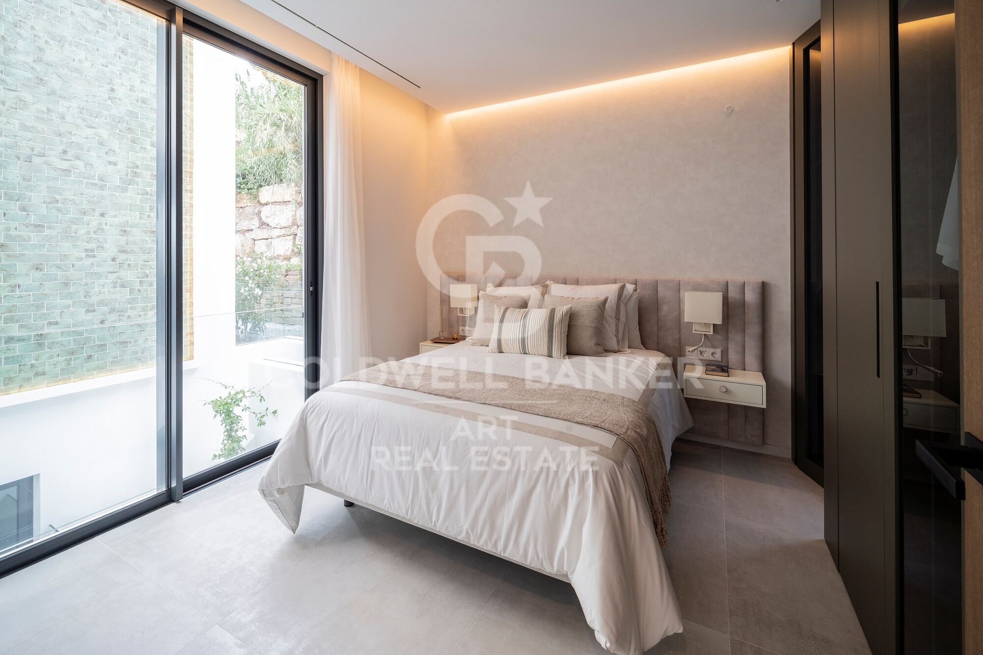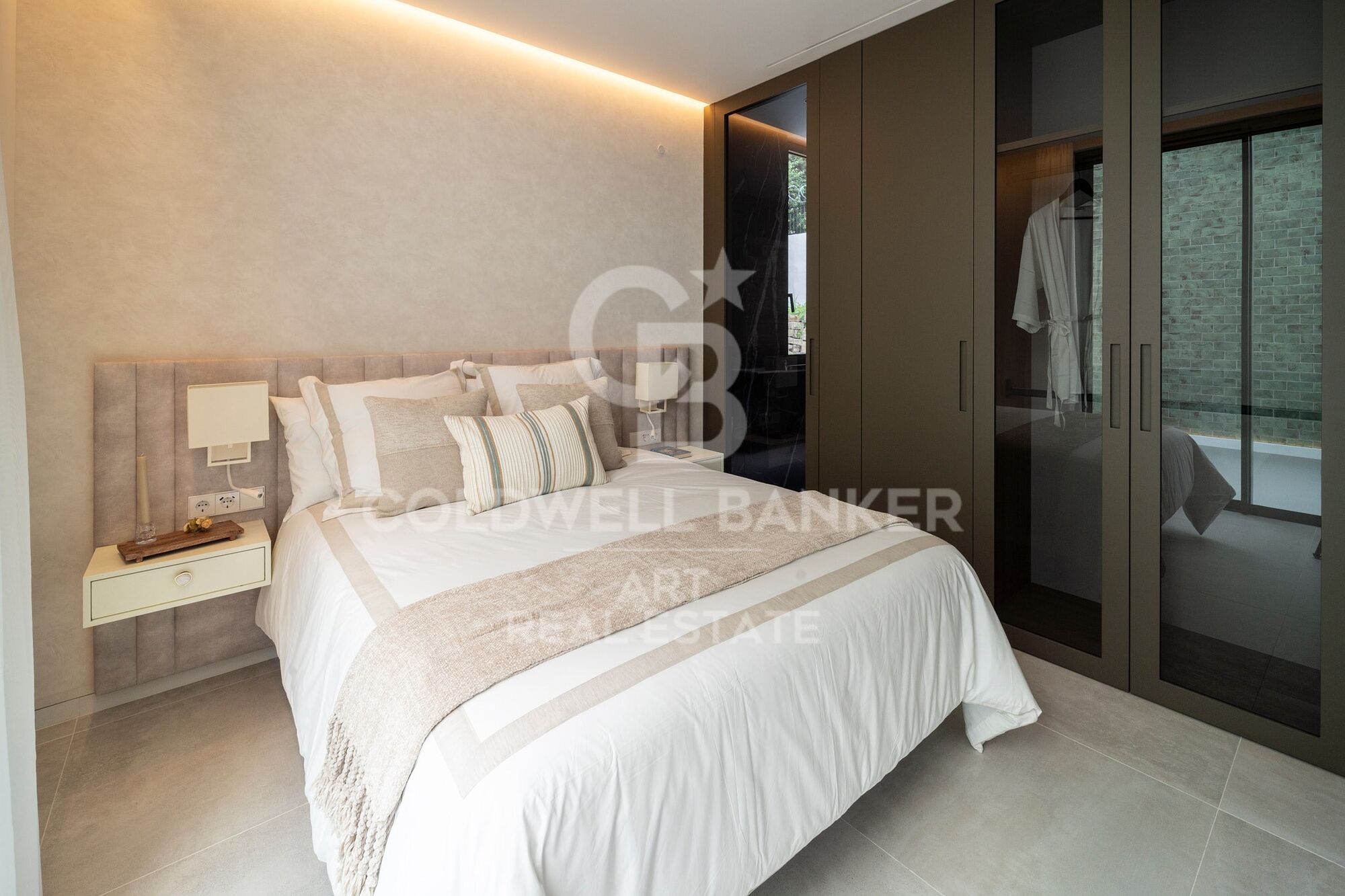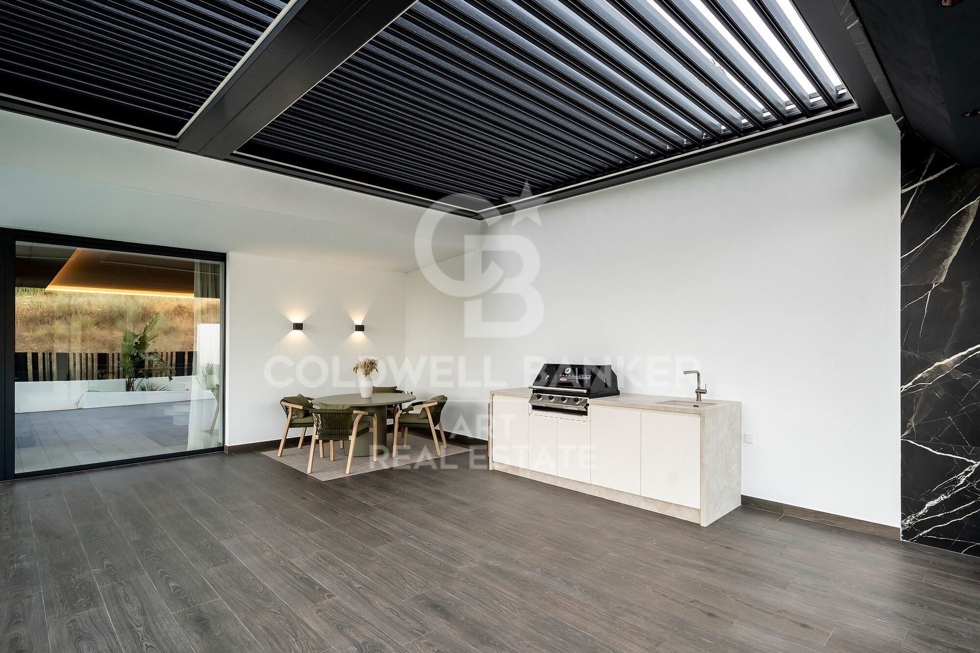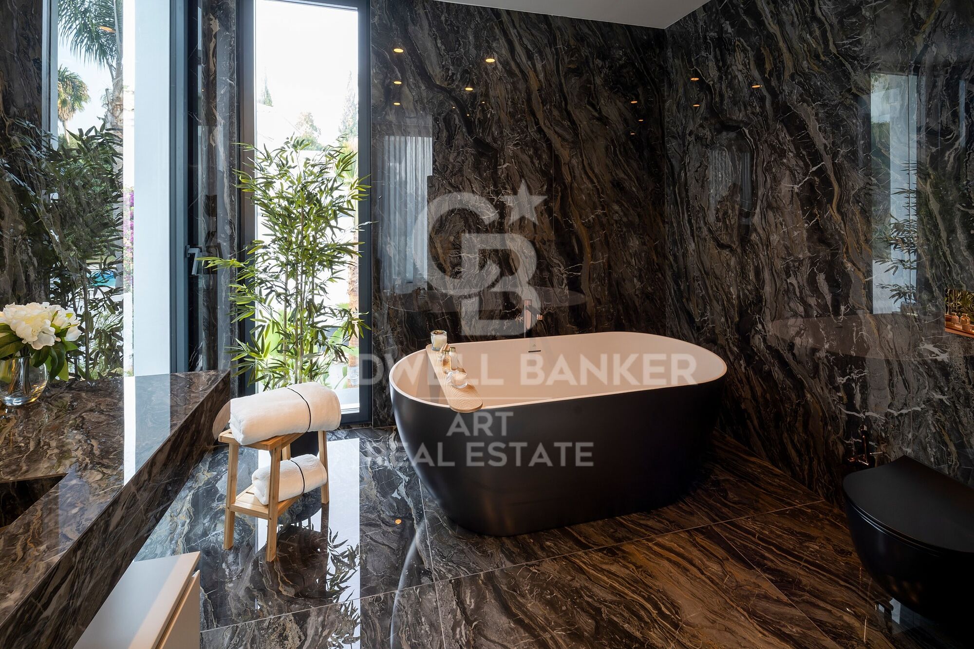 À l'extérieur, un jardin paysager entoure les vastes terrasses, idéales pour se détendre ou organiser des réceptions. La vedette est la spectaculaire piscine à débordement avec cascade, accompagnée d'une cuisine extérieure entièrement équipée, parfaite pour profiter de soirées inoubliables sous les étoiles.
