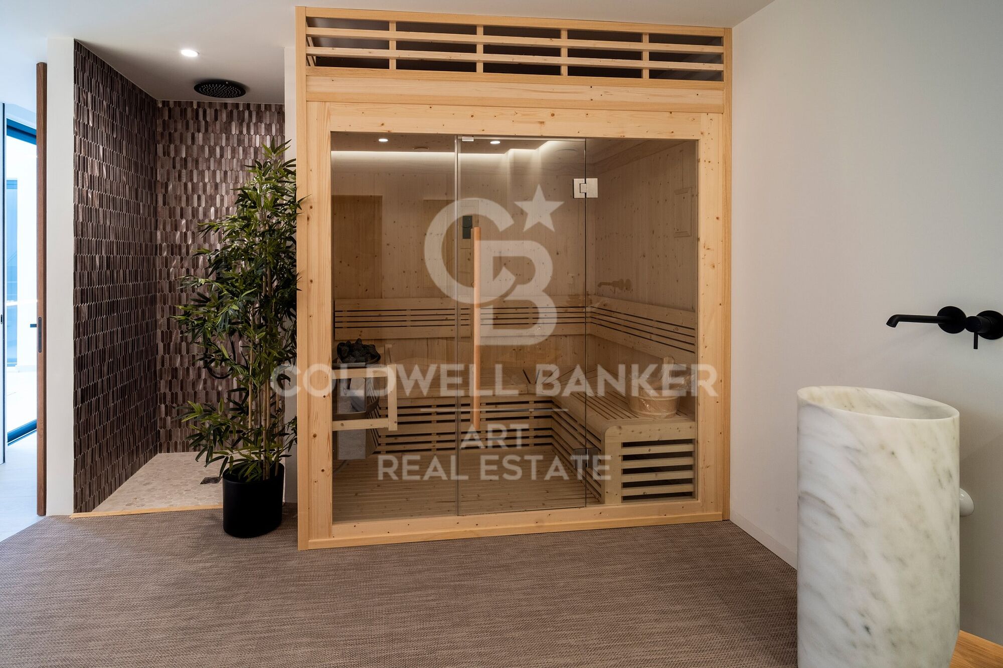 La propriété est répartie sur 4 étages soigneusement conçus, sur un terrain de 1 283 m². Ses vastes espaces de vie ouverts se prolongent grâce à de grandes baies vitrées allant du sol au plafond, inondant les intérieurs de lumière naturelle et créant une transition fluide entre l'intérieur et l'extérieur. La cuisine ultramoderne est équipée d'appareils électroménagers haut de gamme, pensée pour transformer le quotidien en une expérience exceptionnelle.
