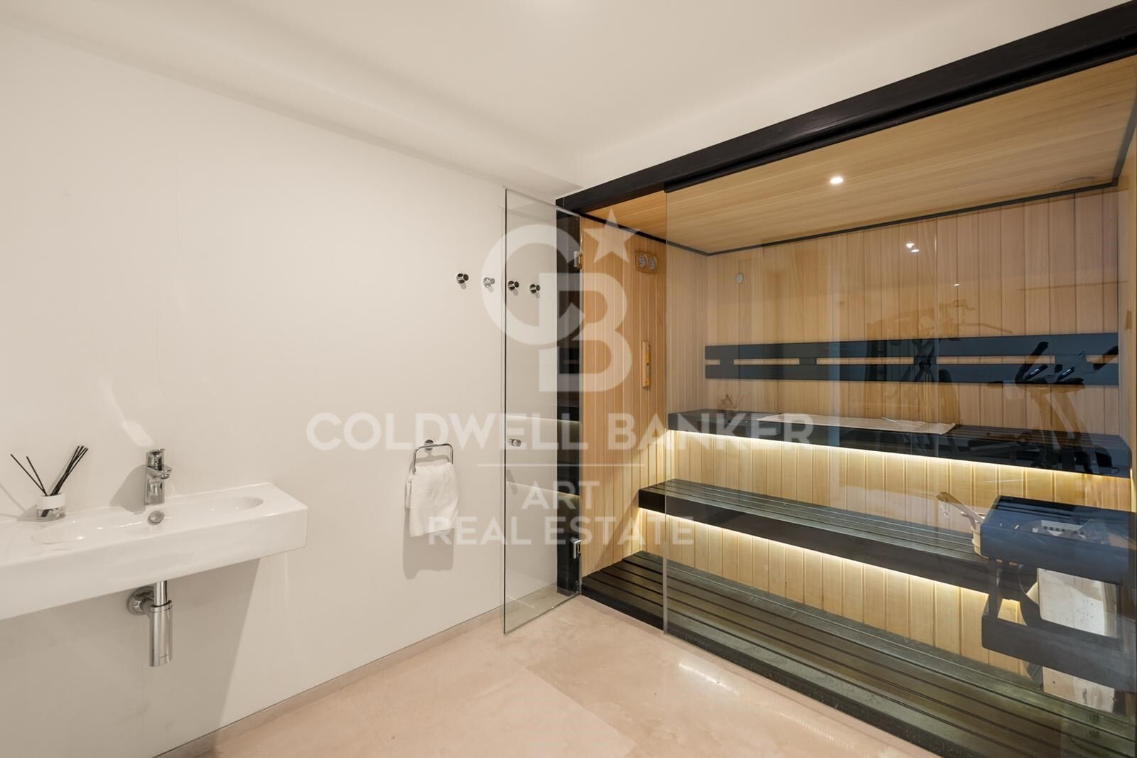 Au niveau inférieur, vous trouverez une zone bien-être et divertissement qui élève encore davantage le style de vie : une salle de sport entièrement équipée, un sauna privé, une salle de cinéma, une buanderie et un garage intérieur pour trois voitures. La villa comprend également un chauffage au sol dans toute la maison, la climatisation, une cheminée et des matériaux naturels raffinés qui apportent chaleur et sophistication à chaque espace.