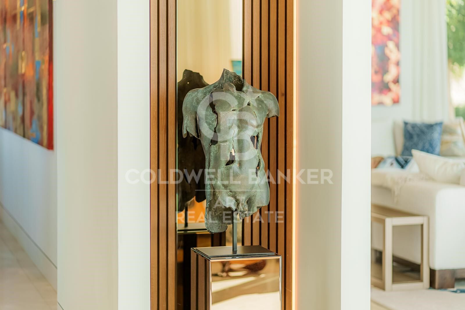 Au cur de la villa se trouve un somptueux salon avec de hauts plafonds et des portes-fenêtres pleine hauteur qui relient parfaitement l'intérieur aux vastes terrasses, aux jardins et à la piscine à débordement. L'agencement ouvert crée une atmosphère accueillante, idéale tant pour les moments intimes que pour recevoir des invités.
