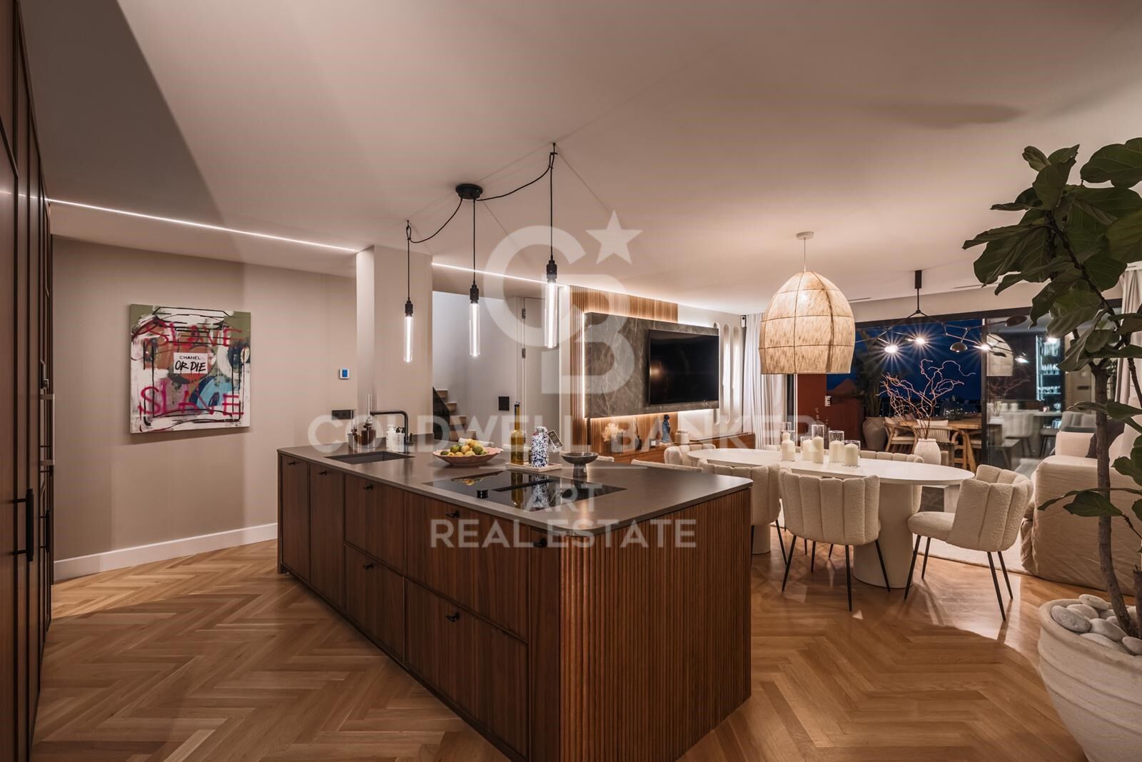 La cuisine, au design nordique en noyer naturel, est équipée d'appareils Gaggenau et Smeg et intégrée dans le salon-salle à manger, idéale pour les réunions informelles et les dîners élégants. Toutes les menuiseries ont été réalisées sur mesure, assurant une esthétique uniforme et raffinée.